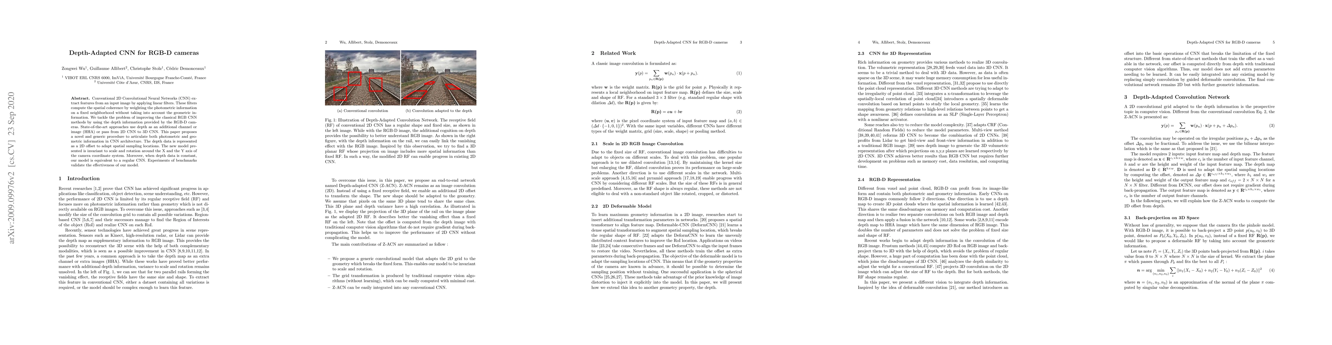 This paper proposes a depth-adapted CNN that integrates depth information from RGB-D cameras to enhance feature extraction, representing depth as a 2D offset to adjust spatial sampling. The model is invariant to scale and rotation, and performs equivalently to a regular CNN when depth data is constant.