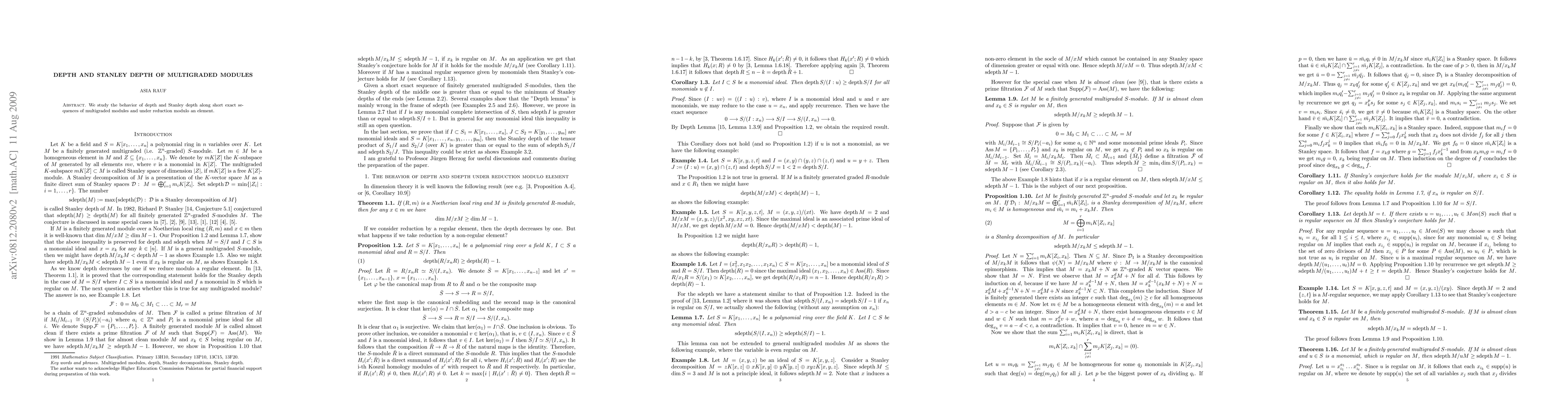 Summary: This paper investigates how depth and Stanley depth change in multigraded modules through short exact sequences and under reduction by a single element. The findings provide insights into the persistence of these algebraic invariants in graded module contexts.