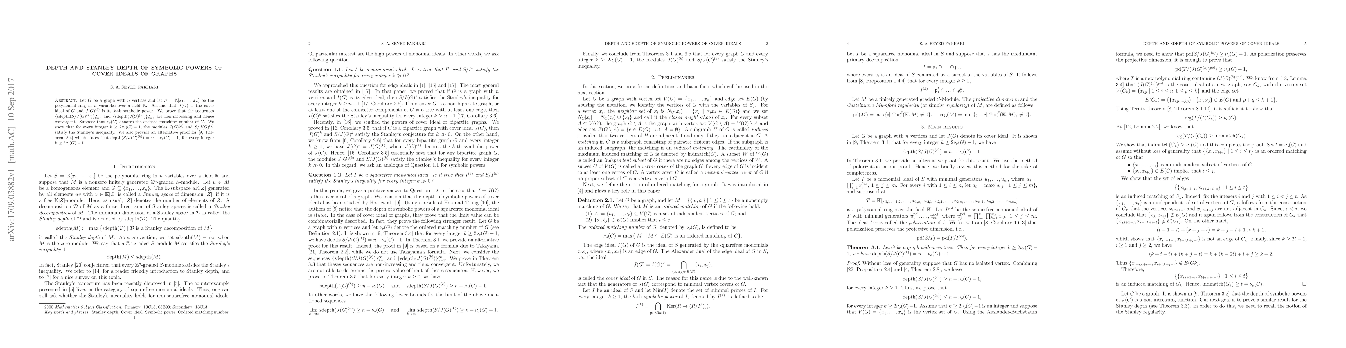 Let $G$ be a graph with $n$ vertices and let $S=\mathbb{K}[x_1,\dots,x_n]$ be the polynomial ring in $n$ variables over a field $\mathbb{K}$. Assume that $J(G)$ is the cover ideal of $G$ and $J(G)^{(k)}$ is its $k$-th symbolic power. We prove that the sequences $\{{\rm sdepth}(S/J(G)^{(k)})\}_{k=1}^\infty$ and $\{{\rm sdepth}(J(G)^{(k)})\}_{k=1}^\infty$ are non-increasing and hence convergent. Suppose that $\nu_{o}(G)$ denotes the ordered matching number of $G$. We show that for every integer $k\geq 2\nu_{o}(G)-1$, the modules $J(G)^{(k)}$ and $S/J(G)^{(k)}$ satisfy the Stanley's inequality. We also provide an alternative proof for \cite[Theorem 3.4]{hktt} which states that ${\rm depth}(S/J(G)^{(k)})=n-\nu_{o}(G)-1$, for every integer $k\geq 2\nu_{o}(G)-1$.