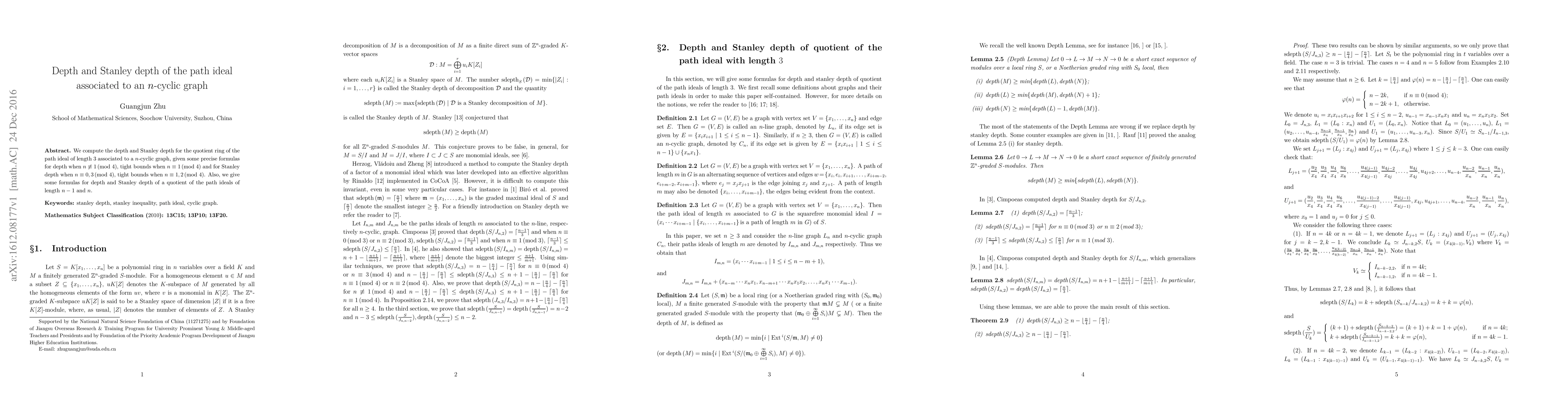 This paper calculates the depth and Stanley depth for path ideals in $n$-cyclic graphs, providing specific formulas and tight bounds for various $n$ values, and extending the analysis to quotients of path ideals of different lengths.