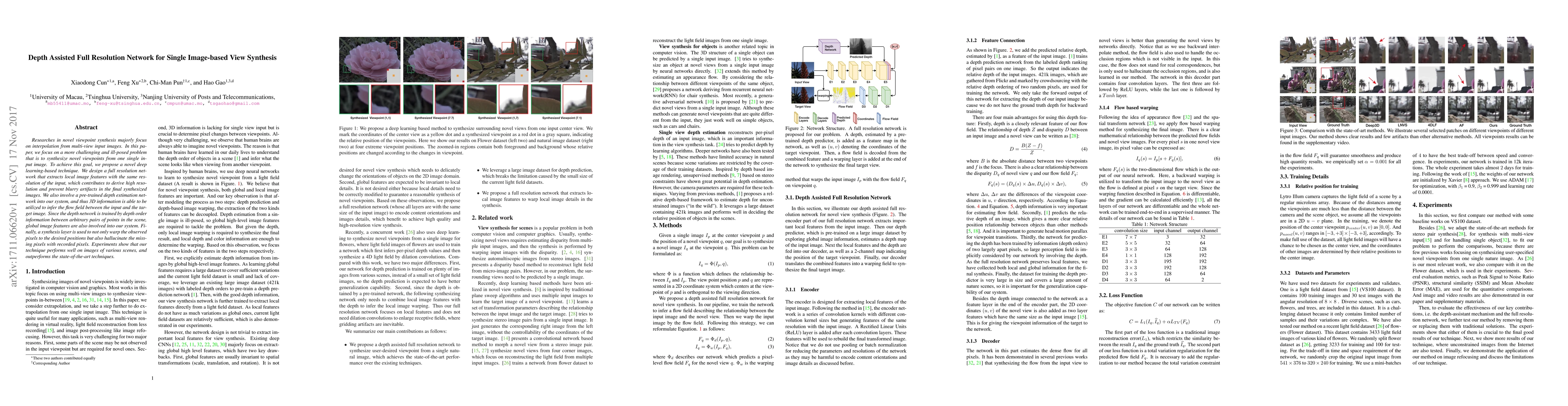 Researches in novel viewpoint synthesis majorly focus on interpolation from multi-view input images. In this paper, we focus on a more challenging and ill-posed problem that is to synthesize novel viewpoints from one single input image. To achieve this goal, we propose a novel deep learning-based technique. We design a full resolution network that extracts local image features with the same resolution of the input, which contributes to derive high resolution and prevent blurry artifacts in the final synthesized images. We also involve a pre-trained depth estimation network into our system, and thus 3D information is able to be utilized to infer the flow field between the input and the target image. Since the depth network is trained by depth order information between arbitrary pairs of points in the scene, global image features are also involved into our system. Finally, a synthesis layer is used to not only warp the observed pixels to the desired positions but also hallucinate the missing pixels with recorded pixels. Experiments show that our technique performs well on images of various scenes, and outperforms the state-of-the-art techniques.