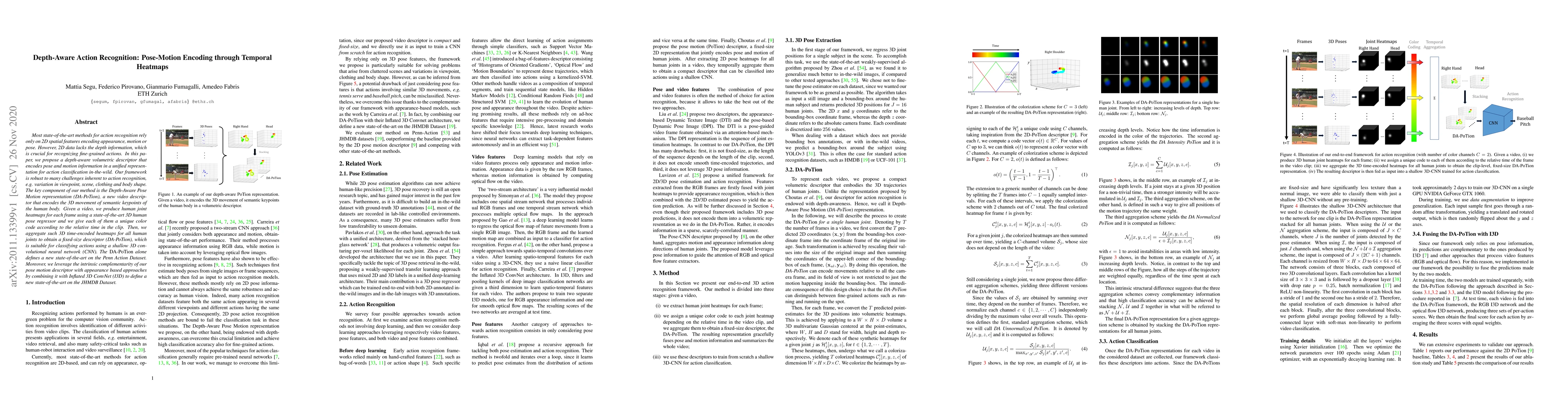 This research introduces a novel depth-aware volumetric descriptor called Depth-Aware Pose Motion (DA-PoTion) for action recognition in videos. The method encodes pose and motion information using 3D human joint heatmaps, which are aggregated to form a robust video descriptor suitable for classification. The DA-PoTion descriptor, combined with Inflated 3D ConvNet (I3D), achieves state-of-the-art results on the Penn Action and JHMDB Datasets, demonstrating its effectiveness in handling variations in viewpoint, scene, and other factors.