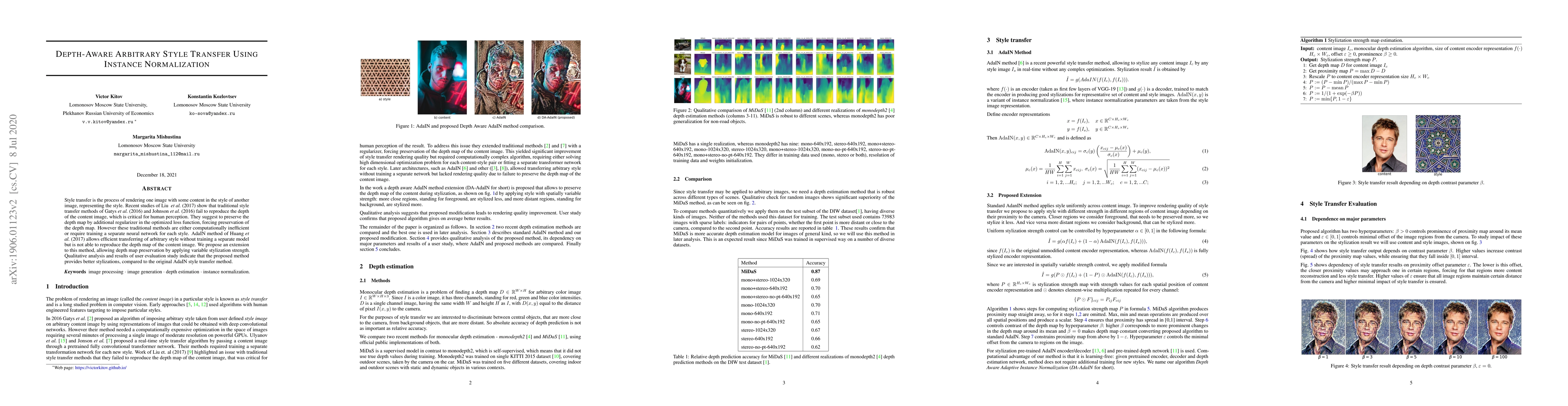 This paper proposes an extension to the AdaIN style transfer method to preserve depth information in the content image, addressing the limitations of traditional style transfer methods. The new approach uses variable stylization strength to maintain depth maps, resulting in more perceptually accurate stylizations, as shown by qualitative analysis and user evaluations.