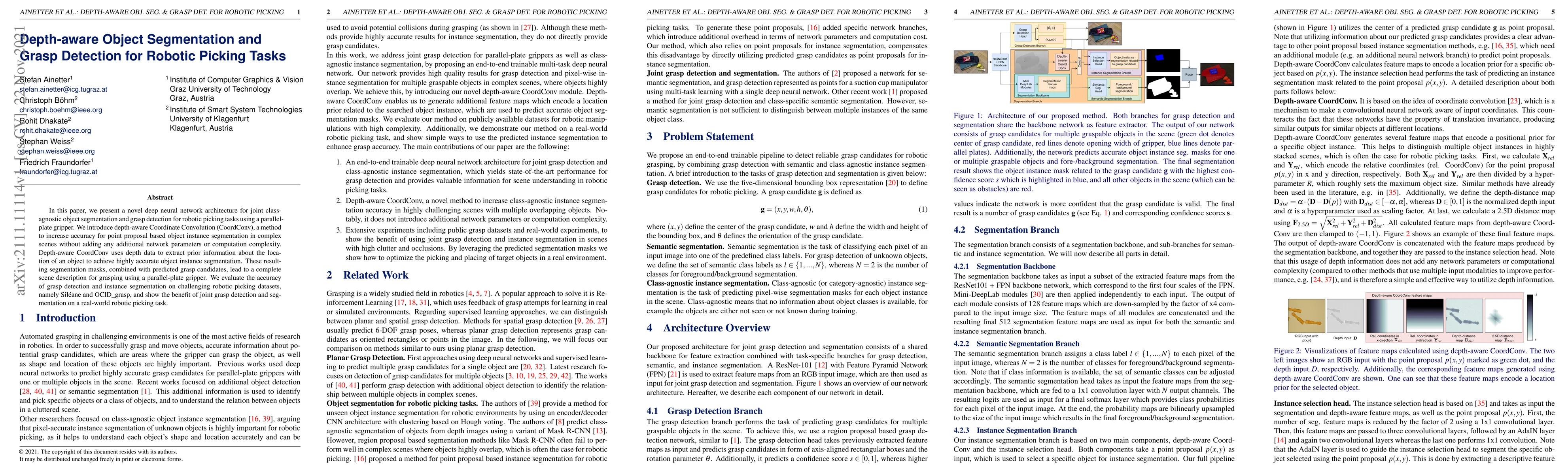 This paper introduces a novel deep neural network for simultaneous object segmentation and grasp detection in robotic picking tasks, utilizing a parallel-plate gripper. It employs depth-aware Coordinate Convolution (CoordConv) to enhance segmentation accuracy without additional computational overhead, achieving high performance on datasets like Sil\'eane and OCID_grasp.