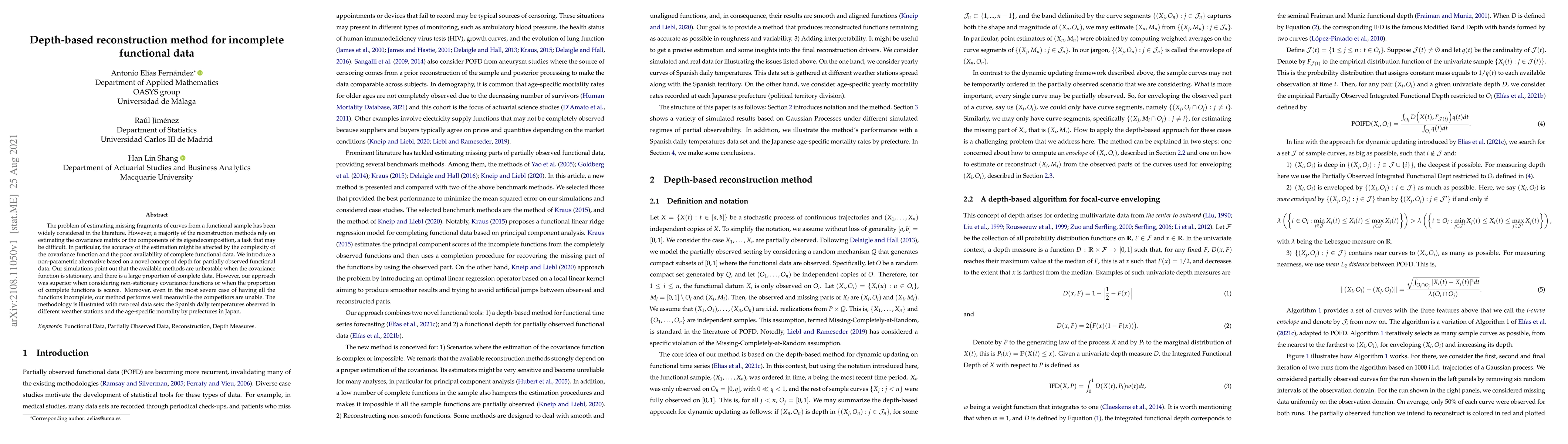 The problem of estimating missing fragments of curves from a functional sample has been widely considered in the literature. However, a majority of the reconstruction methods rely on estimating the covariance matrix or the components of its eigendecomposition, a task that may be difficult. In particular, the accuracy of the estimation might be affected by the complexity of the covariance function and the poor availability of complete functional data. We introduce a non-parametric alternative based on a novel concept of depth for partially observed functional data. Our simulations point out that the available methods are unbeatable when the covariance function is stationary, and there is a large proportion of complete data. However, our approach was superior when considering non-stationary covariance functions or when the proportion of complete functions is scarce. Moreover, even in the most severe case of having all the functions incomplete, our method performs well meanwhile the competitors are unable. The methodology is illustrated with two real data sets: the Spanish daily temperatures observed in different weather stations and the age-specific mortality by prefectures in Japan.
