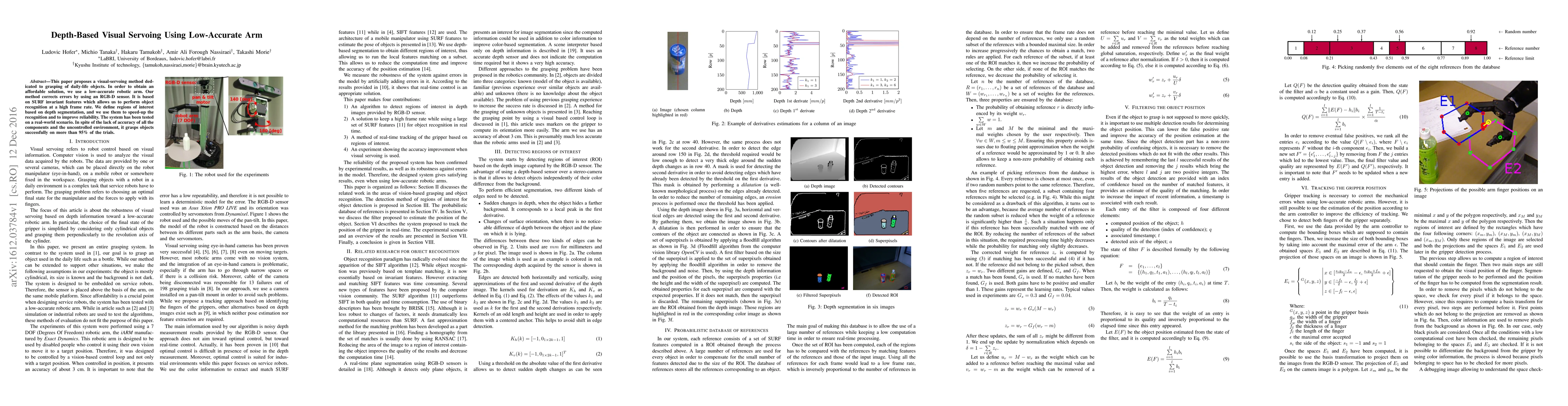 This paper proposes a visual-servoing method dedicated to grasping of daily-life objects. In order to obtain an affordable solution, we use a low-accurate robotic arm. Our method corrects errors by using an RGB-D sensor. It is based on SURF invariant features which allows us to perform object recognition at a high frame rate. We define regions of interest based on depth segmentation, and we use them to speed-up the recognition and to improve reliability. The system has been tested on a real-world scenario. In spite of the lack of accuracy of all the components and the uncontrolled environment, it grasps objects successfully on more than 95 percents of the trials.
