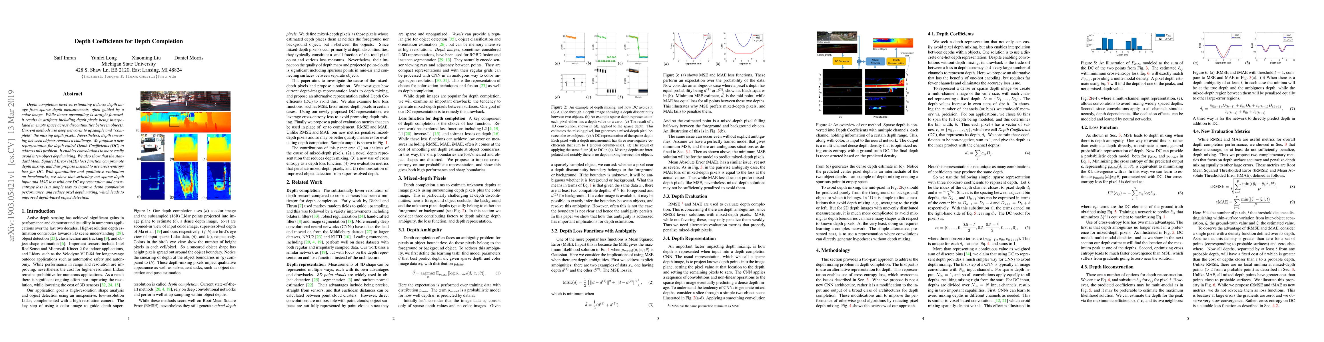 This paper proposes a new Depth Coefficients (DC) representation to improve depth completion from sparse depth measurements, addressing the issue of depth smearing between objects. It replaces the standard MSE loss with cross-entropy loss to better avoid inter-object depth mixing, resulting in improved depth-based object detection.