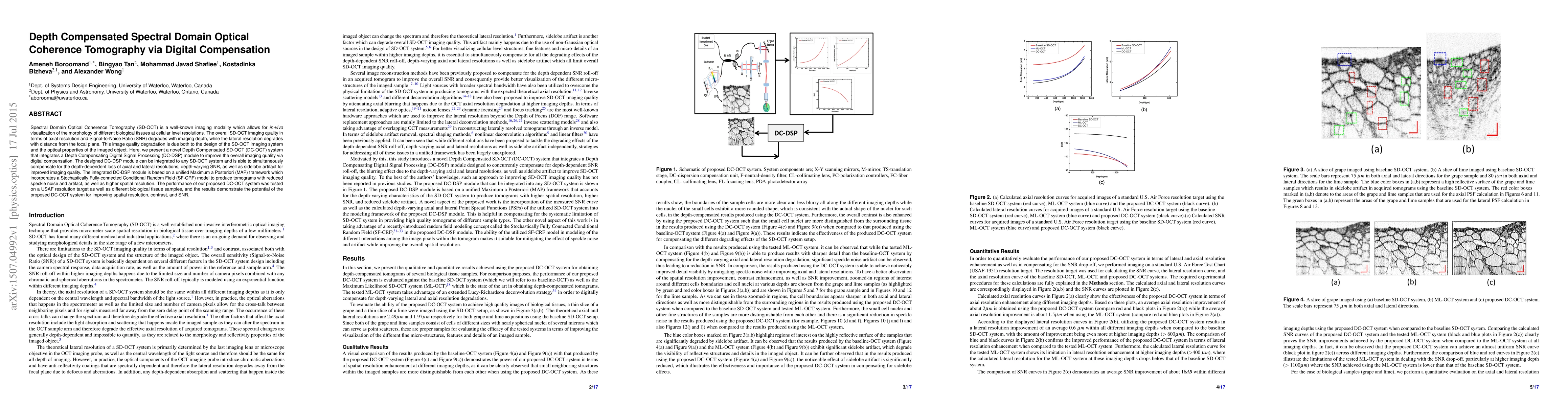 The research introduces Depth Compensated Spectral Domain Optical Coherence Tomography (DC-OCT), a novel system that enhances imaging quality in SD-OCT by digitally compensating for depth-dependent resolution degradation and artifacts. The system's Digital Signal Processing (DC-DSP) module, based on a unified MAP framework with SF-CRF model, reduces speckle noise and improves spatial resolution, contrast, and SNR in both test targets and biological tissue samples.