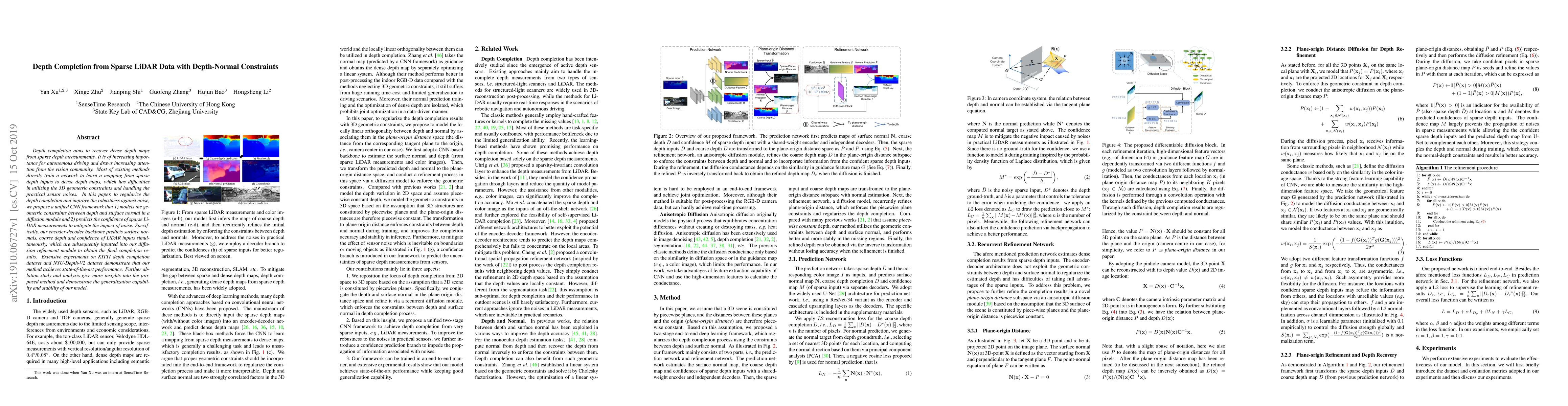 This paper proposes a CNN framework for depth completion from sparse LiDAR data, utilizing depth-normal constraints to regularize the process and improve noise robustness. The method predicts surface normals, coarse depth, and LiDAR measurement confidence, refining the results through a diffusion module. Experimental results show state-of-the-art performance on KITTI and NYU-Depth-V2 datasets.
