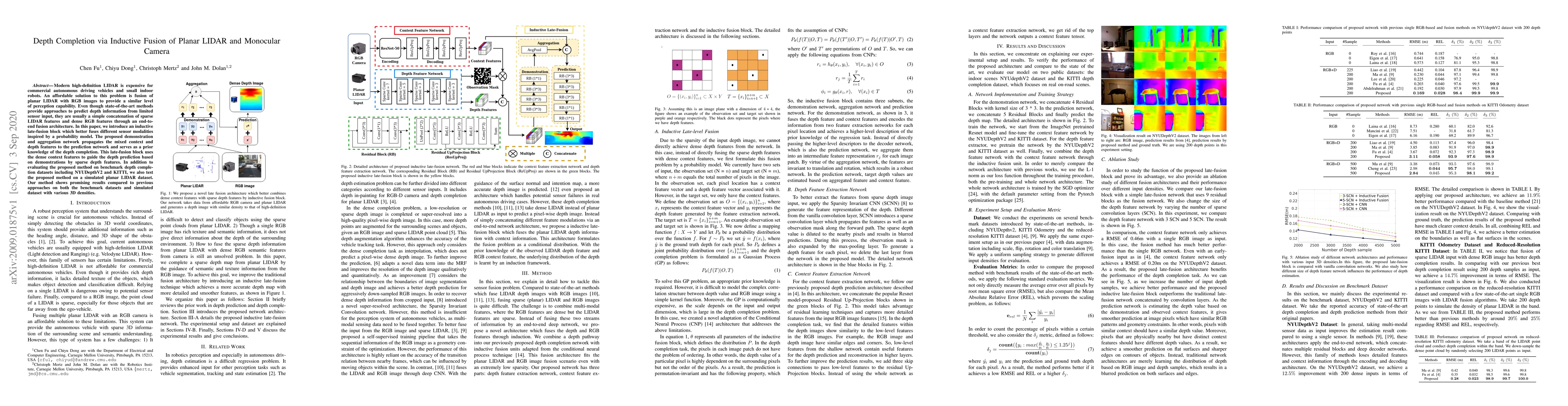 This paper proposes an inductive fusion method to combine planar LIDAR and monocular camera data for depth completion, using a late-fusion block to better integrate sparse LIDAR and dense RGB features. The method demonstrates improved depth prediction performance on benchmark datasets compared to existing methods.