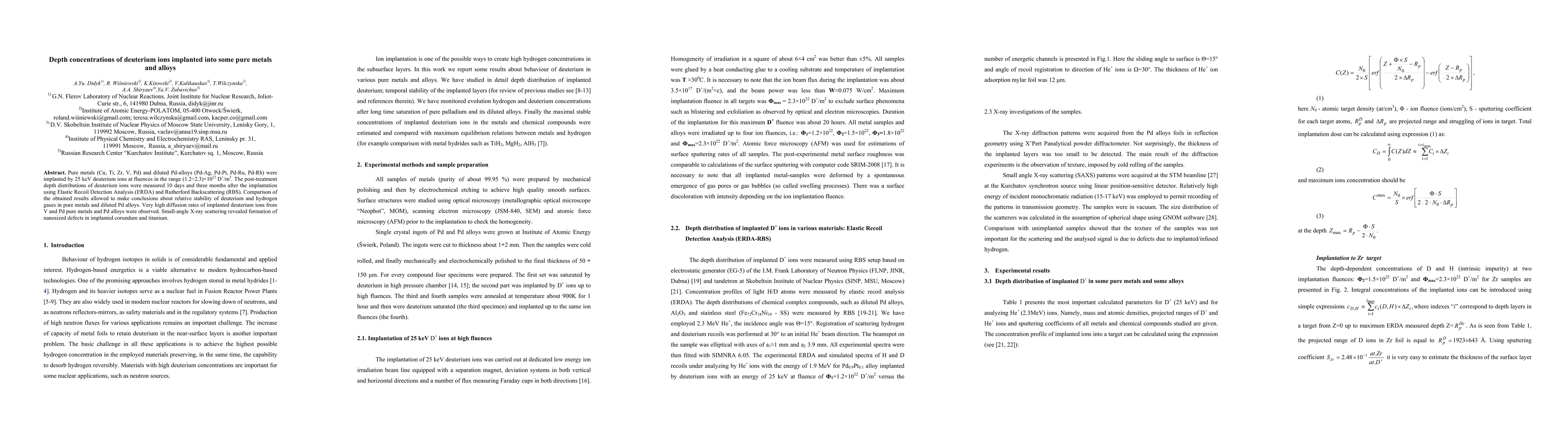This study investigates the depth concentrations of deuterium ions in pure metals and Pd-alloys post-implantation, revealing high diffusion rates and nanosized defect formation, and concludes on the relative stability of deuterium and hydrogen in these materials.