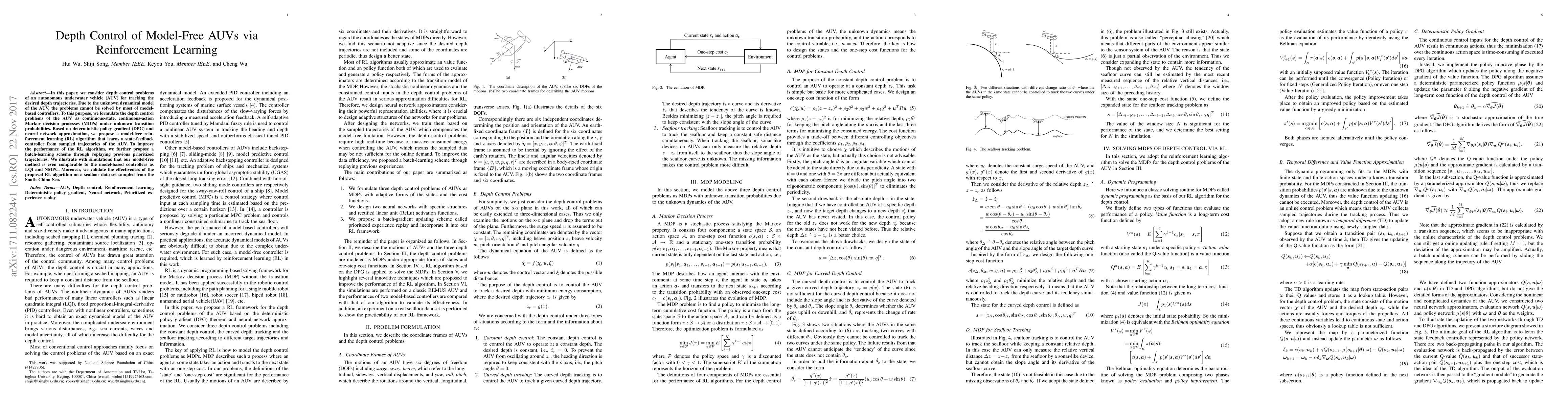 In this paper, we consider depth control problems of an autonomous underwater vehicle (AUV) for tracking the desired depth trajectories. Due to the unknown dynamical model of the AUV, the problems cannot be solved by most of model-based controllers. To this purpose, we formulate the depth control problems of the AUV as continuous-state, continuous-action Markov decision processes (MDPs) under unknown transition probabilities. Based on deterministic policy gradient (DPG) and neural network approximation, we propose a model-free reinforcement learning (RL) algorithm that learns a state-feedback controller from sampled trajectories of the AUV. To improve the performance of the RL algorithm, we further propose a batch-learning scheme through replaying previous prioritized trajectories. We illustrate with simulations that our model-free method is even comparable to the model-based controllers as LQI and NMPC. Moreover, we validate the effectiveness of the proposed RL algorithm on a seafloor data set sampled from the South China Sea.