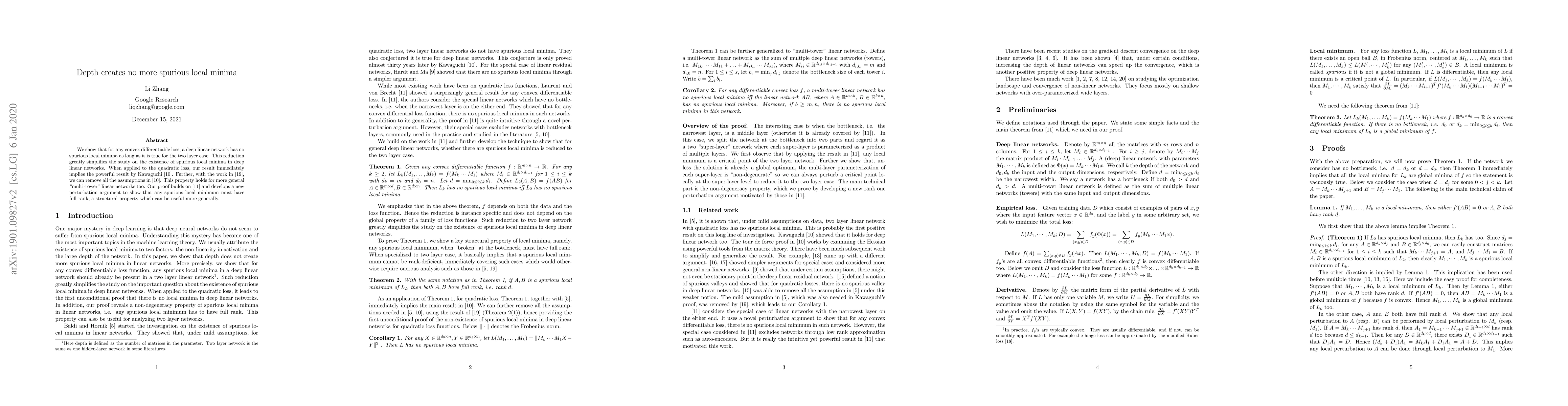This paper demonstrates that deep linear networks, like their two-layer counterparts, do not have spurious local minima for convex differentiable losses. The authors extend this result to "multi-tower" linear networks and provide a new perturbation argument to show that spurious minima, if they exist, must have full rank.