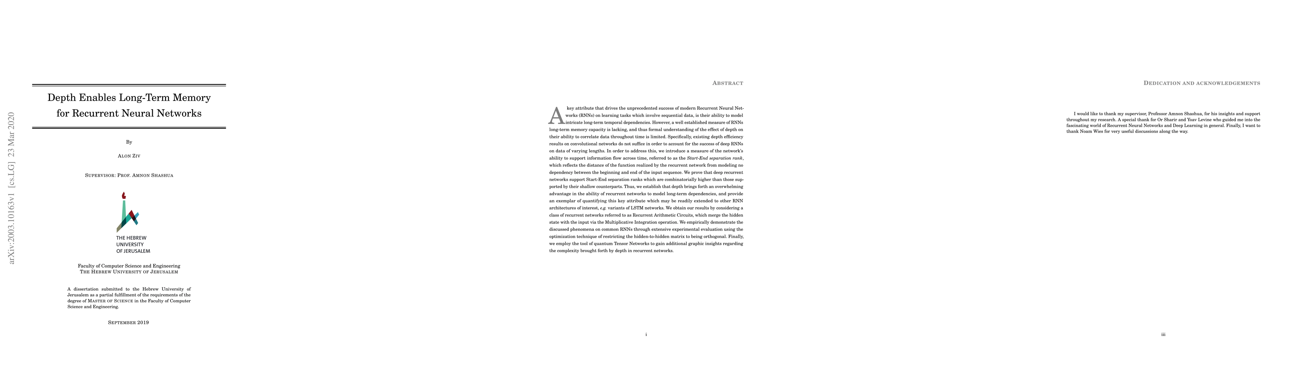 This paper introduces a measure called Start-End separation rank to quantify the long-term memory capacity of Recurrent Neural Networks (RNNs), demonstrating that deeper networks have significantly better performance in modeling long-term dependencies compared to shallow ones. The study provides empirical and theoretical evidence supporting the advantage of depth in RNNs.