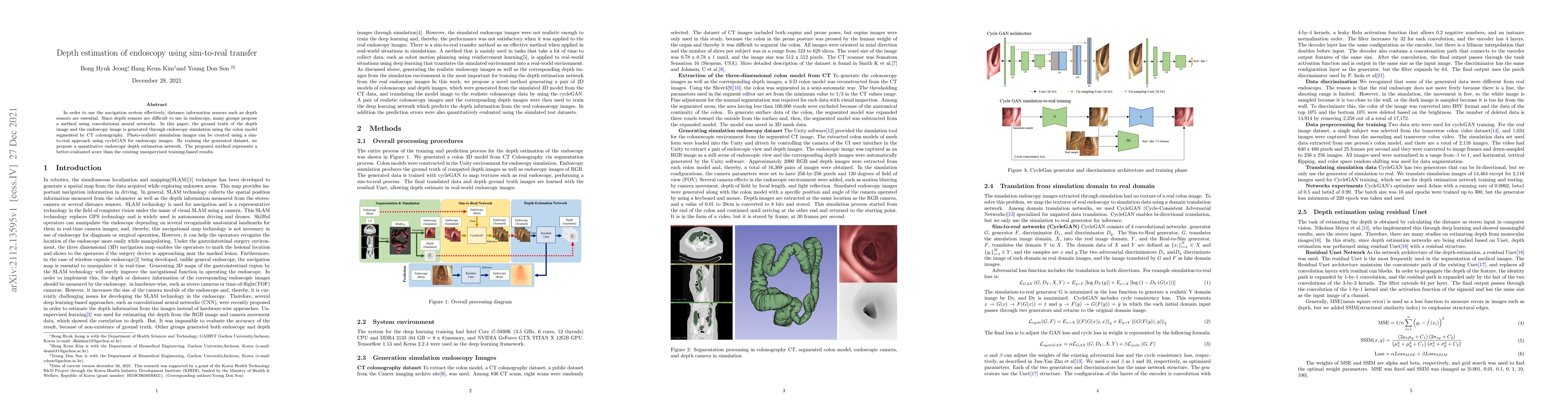 In order to use the navigation system effectively, distance information sensors such as depth sensors are essential. Since depth sensors are difficult to use in endoscopy, many groups propose a method using convolutional neural networks. In this paper, the ground truth of the depth image and the endoscopy image is generated through endoscopy simulation using the colon model segmented by CT colonography. Photo-realistic simulation images can be created using a sim-to-real approach using cycleGAN for endoscopy images. By training the generated dataset, we propose a quantitative endoscopy depth estimation network. The proposed method represents a better-evaluated score than the existing unsupervised training-based results.