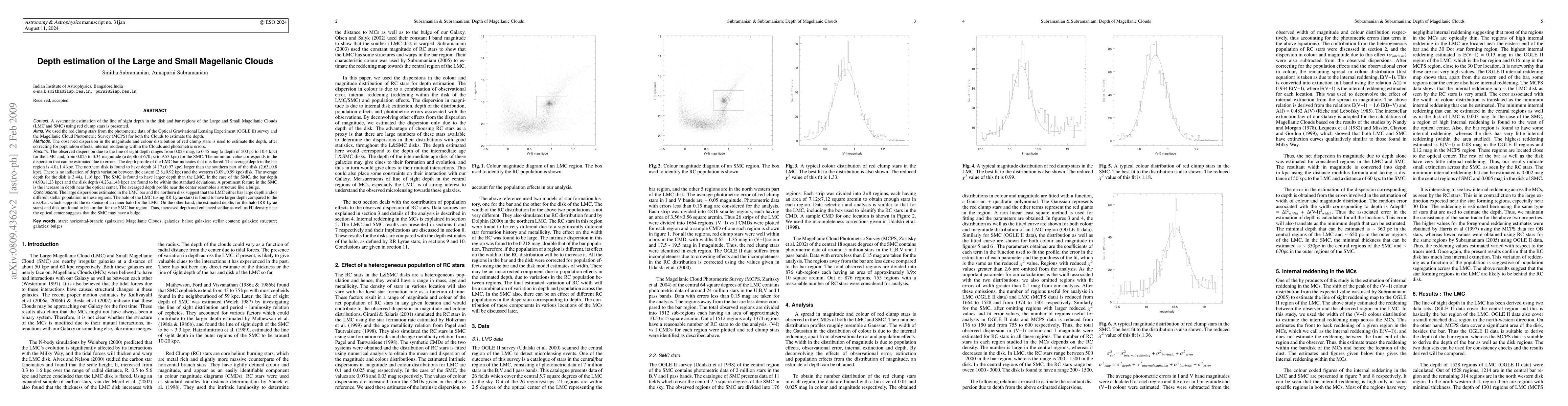 We used the red clump stars from the photometric data of the Optical Gravitational Lensing Experiment(OGLE II) survey and the Magellanic Cloud Photometric Survey (MCPS) for both the Clouds to estimate the depth.The observed dispersion in the magnitude and colour distribution of red clump stars is used to estimate the depth, after correcting for population effects, internal reddening within the Clouds and photometric errors.The observed dispersion due to the line of sight depth ranges from 0.023 mag to 0.45 mag (a depth of 500 pc to 10.4 kpc) for LMC and from 0.025 to 0.34 magnitude(a depth of 670 pc to 9.53 kpc).The depth profile of the LMC bar indicates that it is flared.The average depth in the bar region is 4.0$\pm$1.4 kpc. The northern disk is found to have depth(4.17$\pm$0.97 kpc)larger than the southern part of the disk (2.63$\pm$0.8kpc).There is no indication of depth variation between the eastern and the western disk.The average depth for the disk is 3.44$\pm$ 1.16 kpc.In the case of SMC, the bar depth(4.90$\pm$1.23 kpc)and the disk depth (4.23$\pm$1.48kpc)are found to be within the standard deviations.A prominent feature in the SMC is the increase in depth near the optical center.The large dispersions estimated for the LMC bar and the northern disk suggest that the LMC either has large depth and/or different stellar populations in these regions.The halo of the LMC(using RR Lyrae stars)is found to have larger depth compared to the disk/bar,which supports the existence of an inner halo for the LMC.On the other hand, the estimated depths for the halo(RR Lyrae stars)and disk are found to be similar,for the SMC bar region. Thus,increased depth and enhanced stellar as well as HI density near the optical center suggests that the SMC may have a bulge.