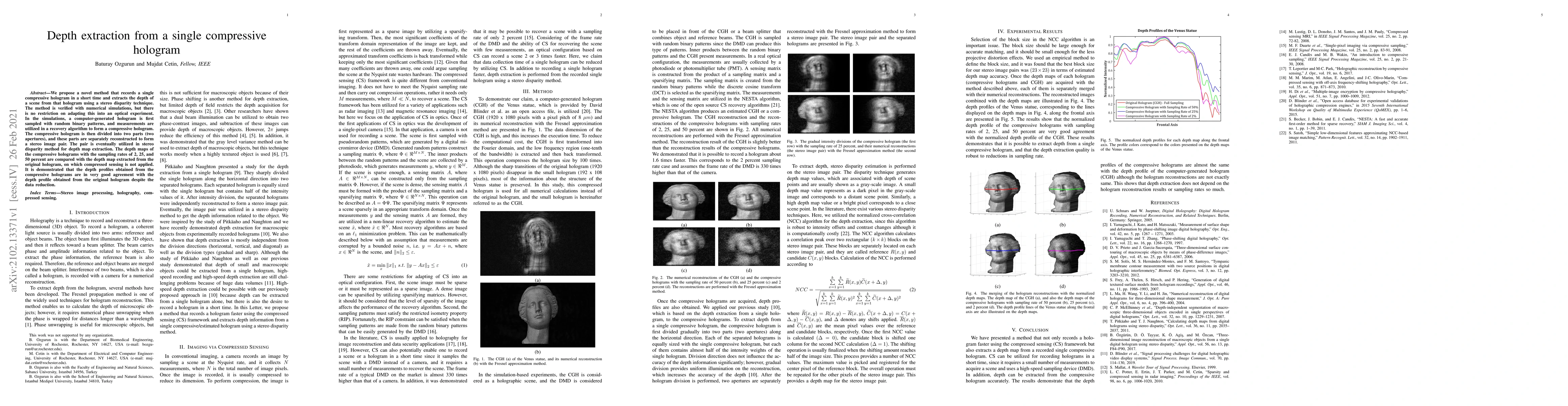 This paper proposes a method to quickly record a single compressive hologram and extract scene depth using stereo disparity. Simulations show that depth maps from compressive holograms match well with those from the original hologram, even with significant data reduction.
