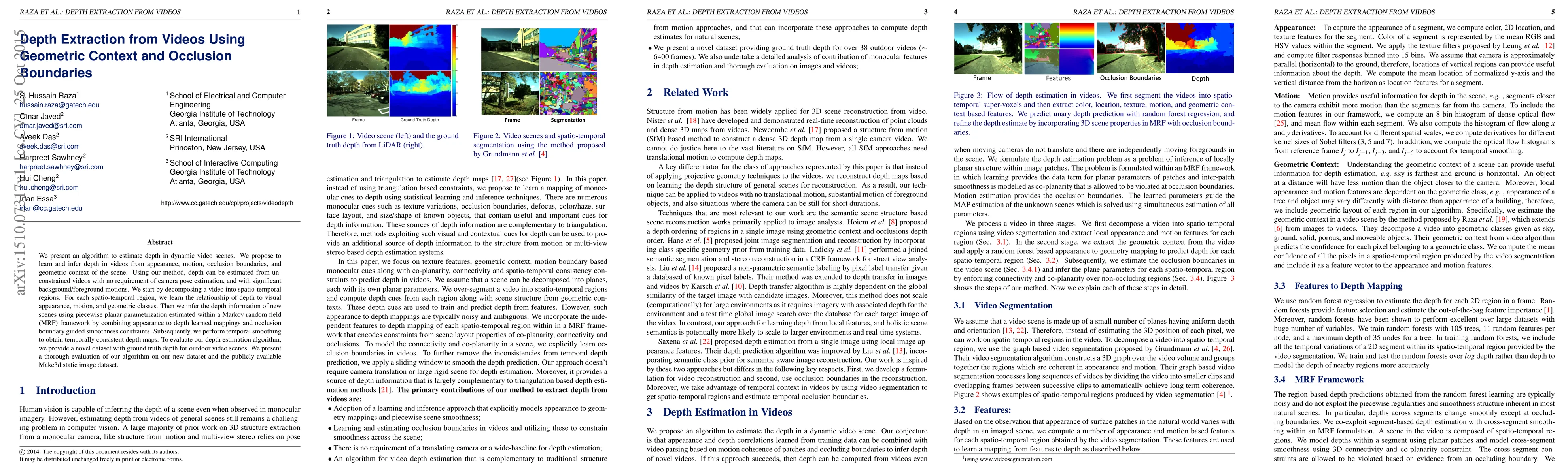 This paper proposes an algorithm to estimate depth in dynamic videos using appearance, motion, occlusion boundaries, and geometric context without requiring camera pose estimation. The method decomposes videos into spatio-temporal regions, learns depth-visual relationships, and infers depth using a Markov random field framework, followed by temporal smoothing for consistency.