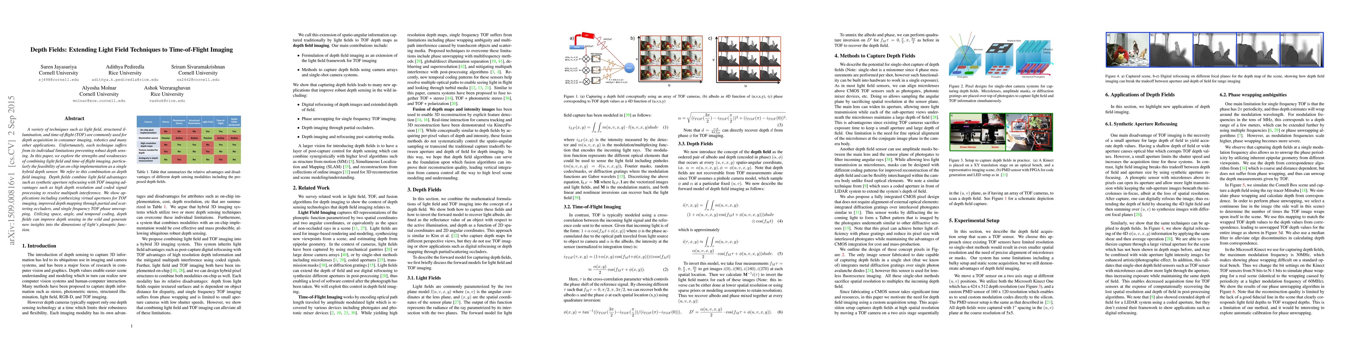 This paper proposes depth fields, a hybrid depth sensing technique that combines light field and time-of-flight imaging to overcome the limitations of each method, achieving improved depth resolution and multipath interference resolution through on-chip integration.