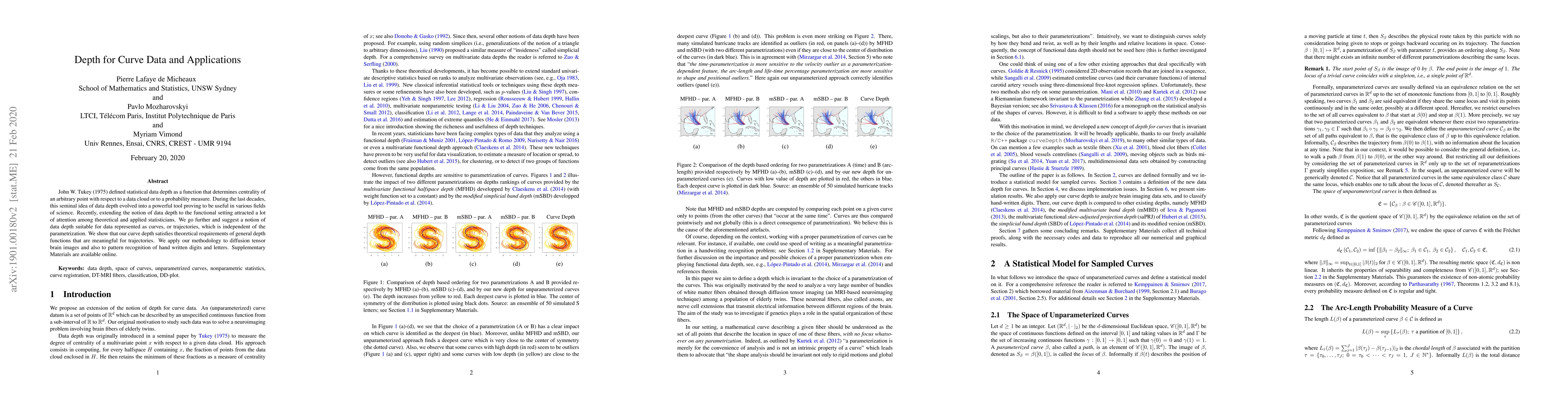 This paper proposes a novel data depth concept for curve data, ensuring it is independent of the parametrization. The authors demonstrate its theoretical soundness and apply it to diffusion tensor brain images and pattern recognition of handwritten digits and letters.