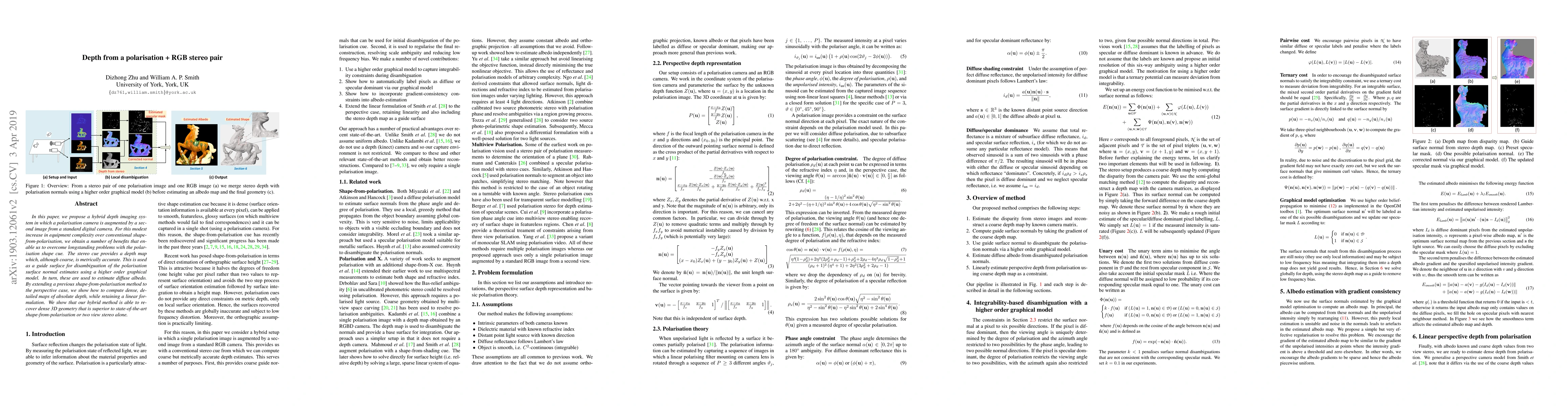 In this paper, we propose a hybrid depth imaging system in which a polarisation camera is augmented by a second image from a standard digital camera. For this modest increase in equipment complexity over conventional shape-from-polarisation, we obtain a number of benefits that enable us to overcome longstanding problems with the polarisation shape cue. The stereo cue provides a depth map which, although coarse, is metrically accurate. This is used as a guide surface for disambiguation of the polarisation surface normal estimates using a higher order graphical model. In turn, these are used to estimate diffuse albedo. By extending a previous shape-from-polarisation method to the perspective case, we show how to compute dense, detailed maps of absolute depth, while retaining a linear formulation. We show that our hybrid method is able to recover dense 3D geometry that is superior to state-of-the-art shape-from-polarisation or two view stereo alone.