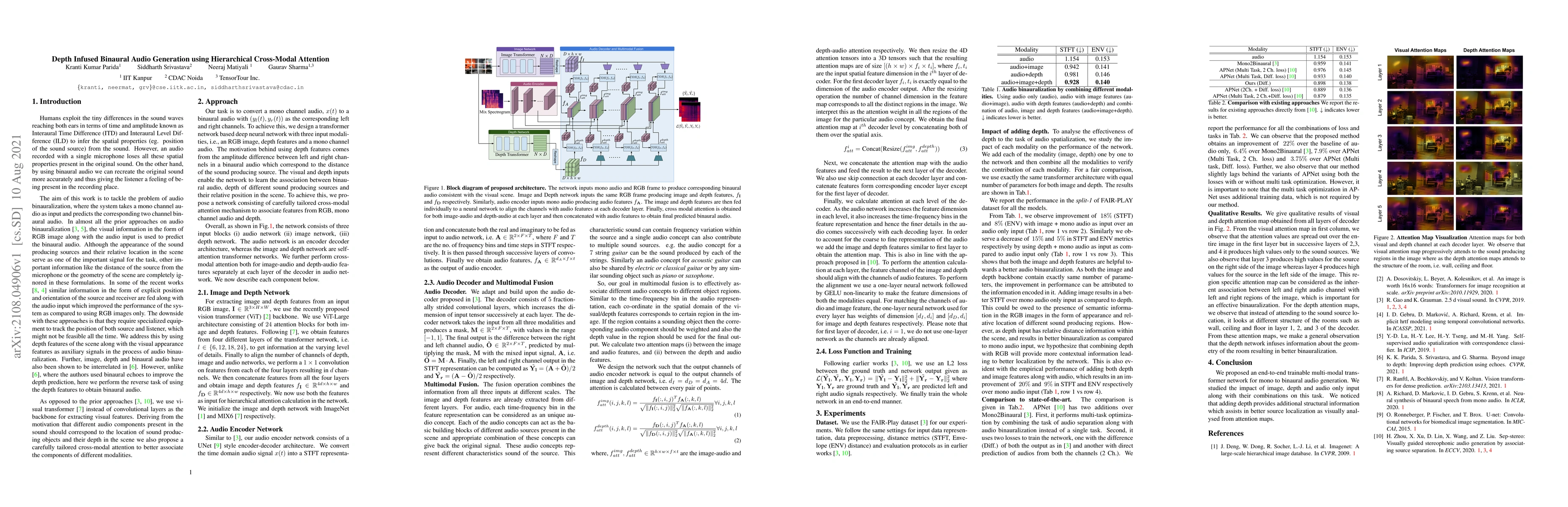 Binaural audio gives the listener the feeling of being in the recording place and enhances the immersive experience if coupled with AR/VR. But the problem with binaural audio recording is that it requires a specialized setup which is not possible to fabricate within handheld devices as compared to traditional mono audio that can be recorded with a single microphone. In order to overcome this drawback, prior works have tried to uplift the mono recorded audio to binaural audio as a post processing step conditioning on the visual input. But all the prior approaches missed other most important information required for the task, i.e. distance of different sound producing objects from the recording setup. In this work, we argue that the depth map of the scene can act as a proxy for encoding distance information of objects in the scene and show that adding depth features along with image features improves the performance both qualitatively and quantitatively. We propose a novel encoder-decoder architecture, where we use a hierarchical attention mechanism to encode the image and depth feature extracted from individual transformer backbone, with audio features at each layer of the decoder.