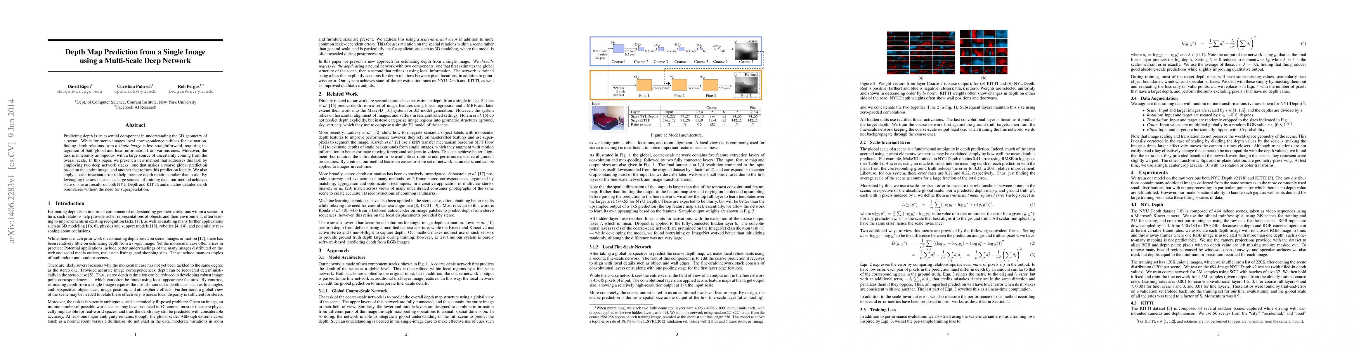 This paper proposes a multi-scale deep network to predict depth maps from a single image, combining coarse global predictions with local refinements. The method uses a scale-invariant error to mitigate scale issues, achieving state-of-the-art results on NYU Depth and KITTI datasets.
