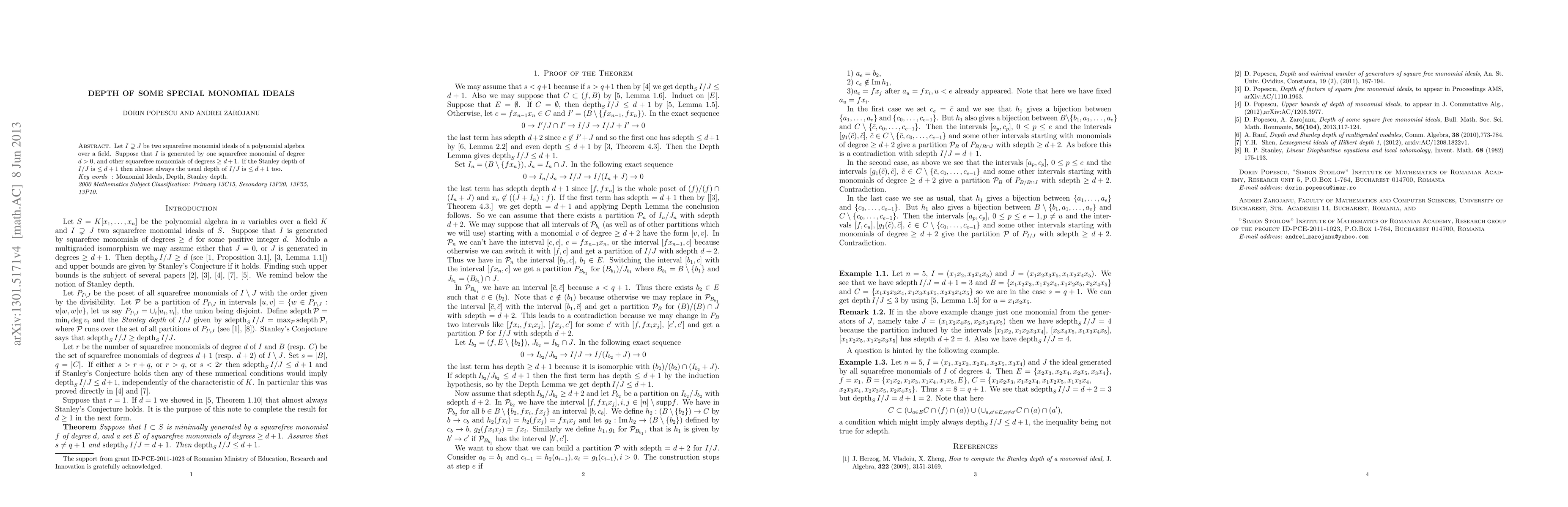 This paper investigates the relationship between the Stanley depth and usual depth of squarefree monomial ideals $I$ and $J$ in a polynomial algebra, where $I$ is generated by a single squarefree monomial of degree $d>0$ and others of degree $\geq d+1$. It concludes that if the Stanley depth of $I/J$ is $\leq d+1$, then the usual depth of $I/J$ is also typically $\leq d+1$.