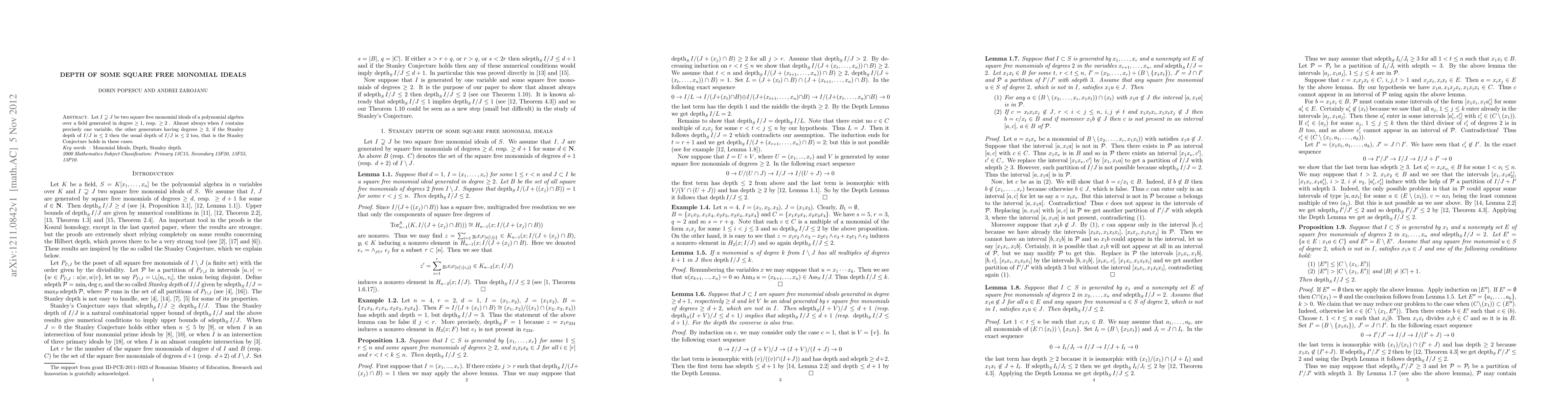 Let $I\supsetneq J$ be two square free monomial ideals of a polynomial algebra over a field generated in degree $\geq 1$, resp. $\geq 2$ . Almost always when $I$ contains precisely one variable, the other generators having degrees $\geq 2$, if the Stanley depth of $I/J$ is $\leq 2$ then the usual depth of $I/J$ is $\leq 2$ too, that is the Stanley Conjecture holds in these cases.