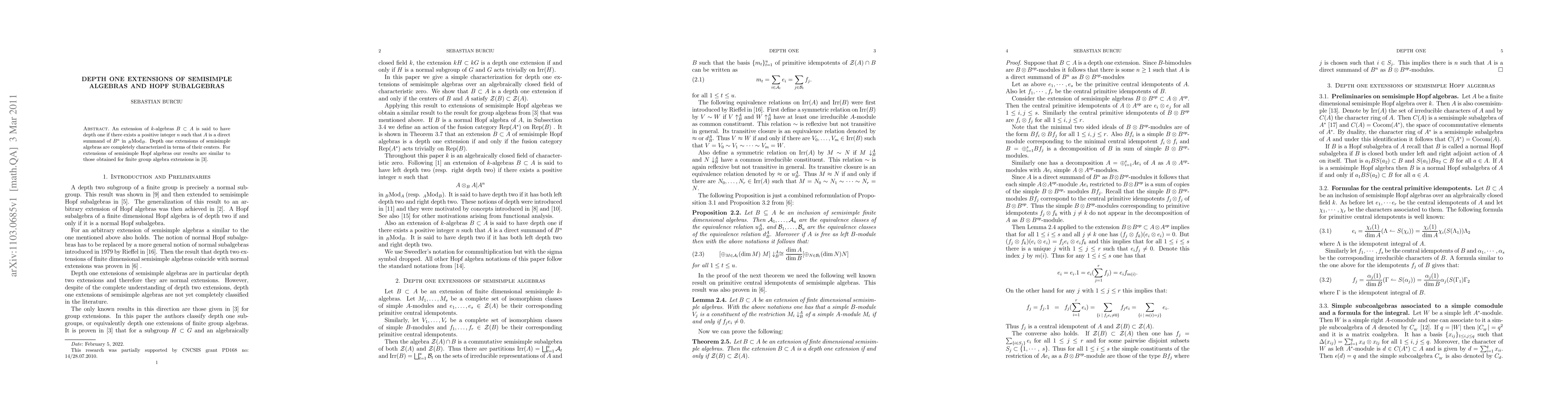 Summary: The paper characterizes depth one extensions of semisimple algebras by relating them to their centers, and extends similar results for finite group algebra extensions to semisimple Hopf subalgebras.