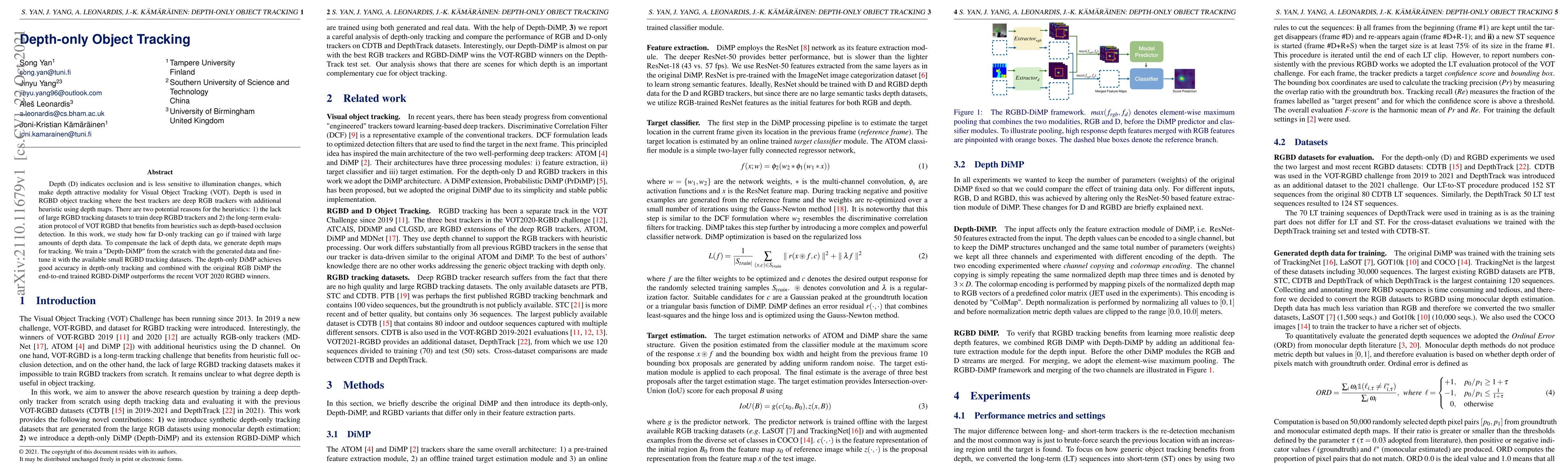 Depth (D) indicates occlusion and is less sensitive to illumination changes, which make depth attractive modality for Visual Object Tracking (VOT). Depth is used in RGBD object tracking where the best trackers are deep RGB trackers with additional heuristic using depth maps. There are two potential reasons for the heuristics: 1) the lack of large RGBD tracking datasets to train deep RGBD trackers and 2) the long-term evaluation protocol of VOT RGBD that benefits from heuristics such as depth-based occlusion detection. In this work, we study how far D-only tracking can go if trained with large amounts of depth data. To compensate the lack of depth data, we generate depth maps for tracking. We train a "Depth-DiMP" from the scratch with the generated data and fine-tune it with the available small RGBD tracking datasets. The depth-only DiMP achieves good accuracy in depth-only tracking and combined with the original RGB DiMP the end-to-end trained RGBD-DiMP outperforms the recent VOT 2020 RGBD winners.