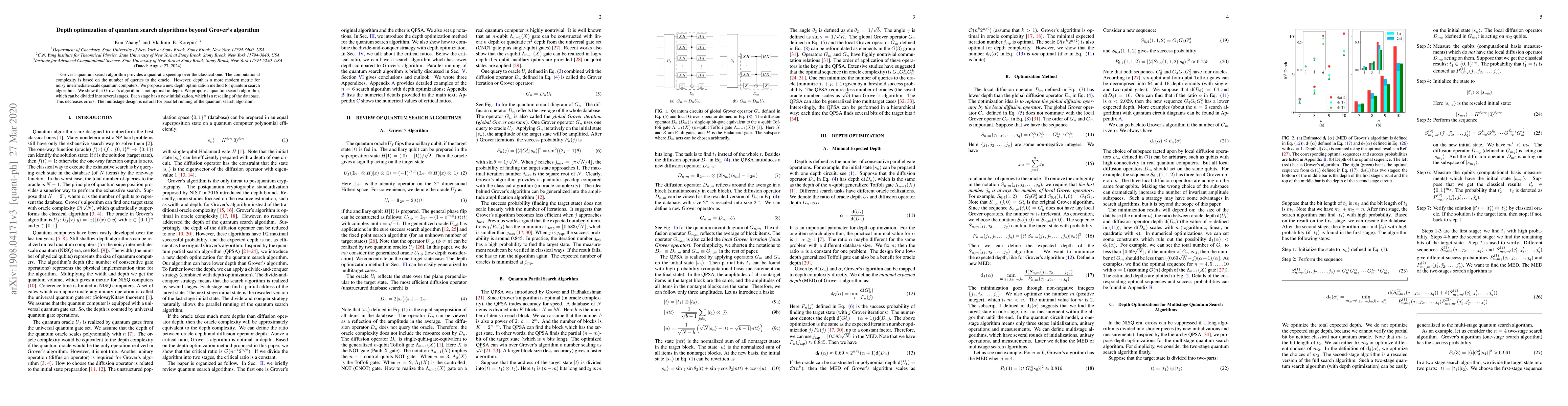 This paper proposes a new depth optimization method for quantum search algorithms, demonstrating that Grover's algorithm is not optimal in terms of depth. The authors introduce a multistage quantum search algorithm with rescaled database initializations to reduce errors, suitable for parallel execution on noisy intermediate-scale quantum computers.