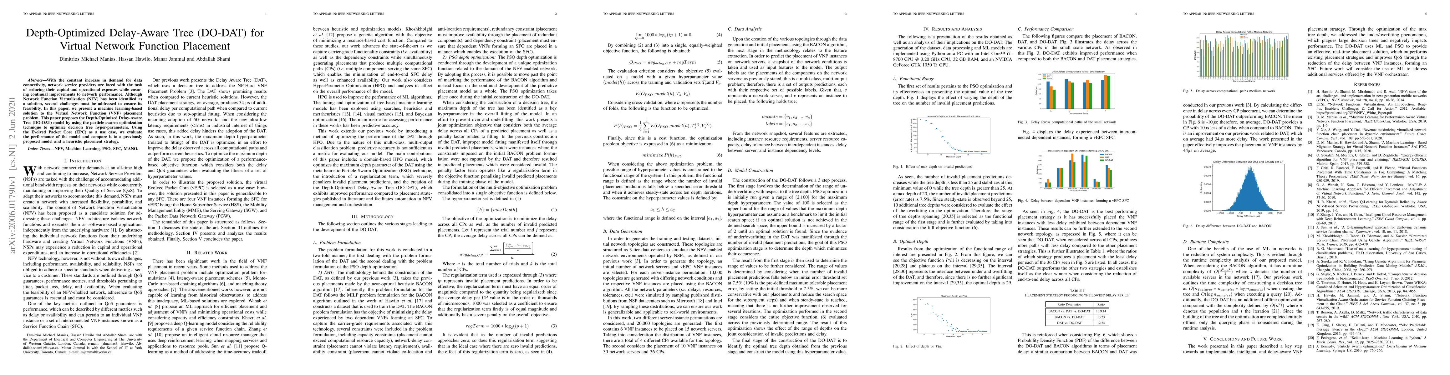This paper introduces the Depth-Optimized Delay-Aware Tree (DO-DAT) model, a machine learning solution for Virtual Network Function placement using particle swarm optimization. The model is evaluated against a previous model and a heuristic strategy using the Evolved Packet Core, demonstrating improved performance.