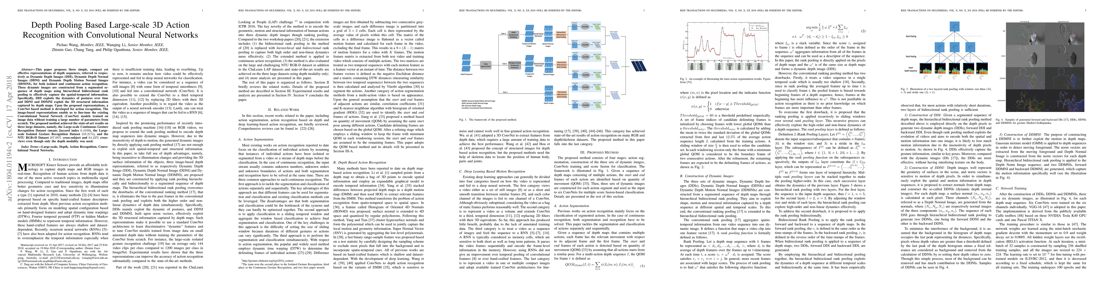 This paper introduces depth sequence representations—Dynamic Depth Images, Dynamic Depth Normal Images, and Dynamic Depth Motion Normal Images—using hierarchical bidirectional rank pooling for large-scale 3D action recognition. A ConvNet-based method leveraging these representations achieves state-of-the-art results on three large datasets.