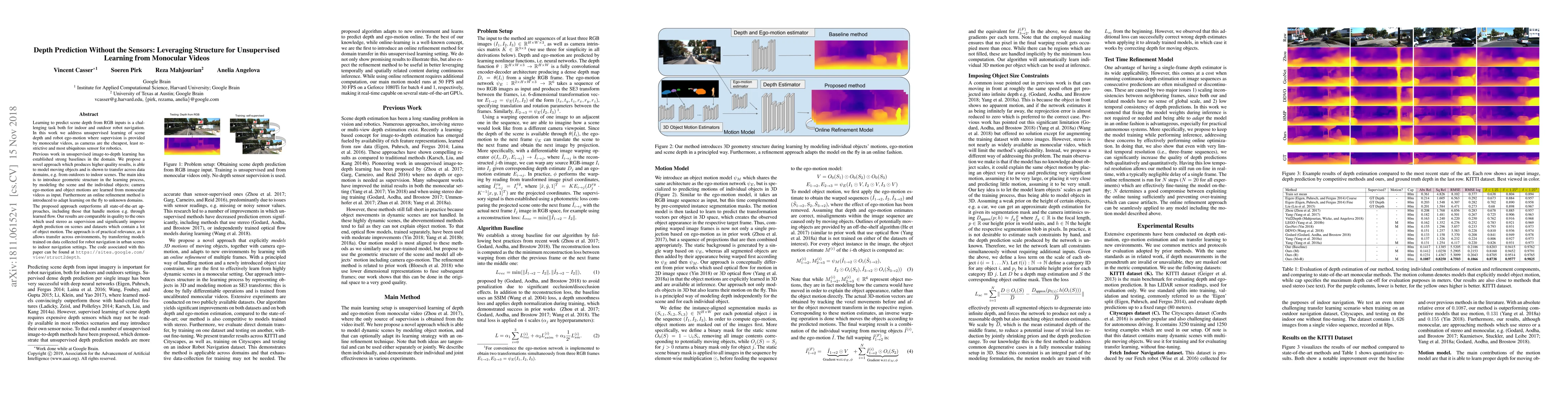 This paper proposes an unsupervised learning method for predicting scene depth from monocular videos by leveraging geometric structure and modeling camera and object motions. The method outperforms existing state-of-the-art approaches, especially in environments with significant object motion, and demonstrates practical transferability across different navigation settings.