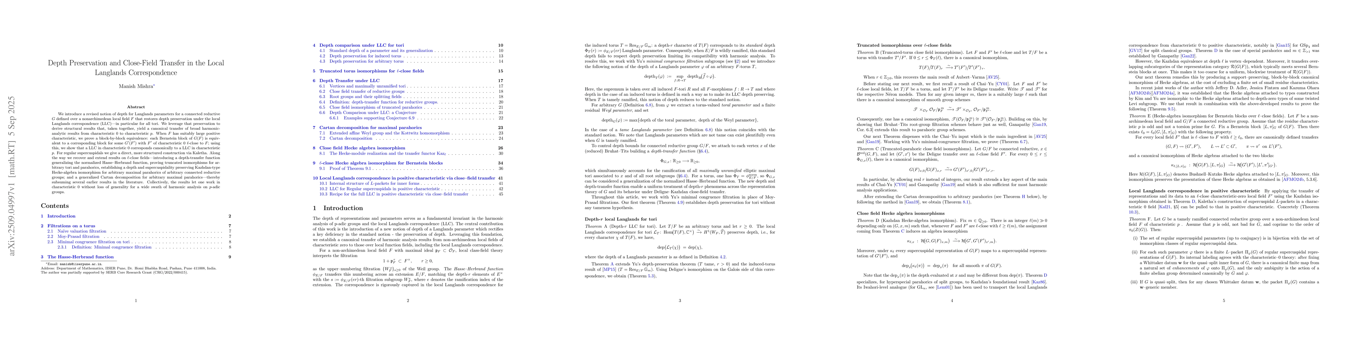 We introduce a revised notion of depth for Langlands parameters for a connected reductive $G$ defined over a nonarchimedean local field $F$ that restores depth preservation under the local Langlands correspondence (LLC) -- in particular for all tori. We leverage that preservation to derive structural results that, taken together, yield a canonical transfer of broad harmonic-analytic results from characteristic $0$ to characteristic $p$. When $F$ has suitably large positive characteristic, we prove a block-by-block equivalence: each Bernstein block of $G(F)$ is equivalent to a corresponding block for some $G'(F')$ with $F'$ of characteristic $0$ $\ell$-close to $F$; using this, we show that an LLC in characteristic $0$ corresponds canonically to an LLC in characteristic $p$. For regular supercuspidals we give a direct, more structured construction via Kaletha. Along the way we recover and extend results on $\ell$-close fields -- introducing a depth-transfer function generalizing the normalized Hasse--Herbrand function, proving truncated isomorphisms for arbitrary tori and parahorics, establishing a depth- and supercuspidality-preserving Kazhdan-type Hecke-algebra isomorphism for arbitrary maximal parahorics of arbitrary connected reductive groups; and a generalized Cartan decomposition for arbitrary maximal parahorics -- thereby subsuming several earlier results in the literature. Collectively, the results let one work in characteristic $0$ without loss of generality for a wide swath of harmonic analysis on $p$-adic groups.