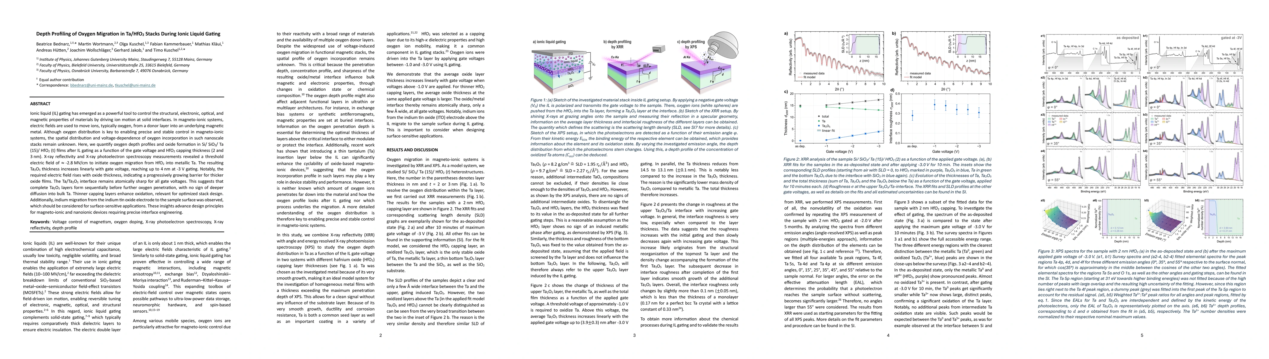 Ionic liquid (IL) gating has emerged as a powerful tool to control the structural, electronic, optical, and magnetic properties of materials by driving ion motion at solid interfaces. In magneto-ionic systems, electric fields are used to move ions, typically oxygen, from a donor layer into an underlying magnetic metal. Although oxygen distribution is key to enabling precise and stable control in magneto-ionic systems, the spatial distribution and voltage-dependence of oxygen incorporation in such nanoscale stacks remain unknown. Here, we quantify oxygen depth profiles and oxide formation in Si/ SiO2/ Ta (15)/ HfO2 (t) films after IL gating as a function of the gate voltage and HfO2 capping thickness (2 and 3 nm). X-ray reflectivity and X-ray photoelectron spectroscopy measurements revealed a threshold electric field of ~ -2.8 MV/cm to initiate oxygen migration from HfO2 into metallic Ta. The resulting Ta2O5 thickness increases linearly with gate voltage, reaching up to 4 nm at -3 V gating. Notably, the required electric field rises with oxide thickness, indicating a progressively growing barrier for thicker oxide films. The Ta/Ta2O5 interface remains atomically sharp for all gate voltages. This suggests that complete Ta2O5 layers form sequentially before further oxygen penetration, with no sign of deeper diffusion into bulk Ta. Thinner capping layers enhance oxidation, relevant for optimized stack design. Additionally, indium migration from the indium tin oxide electrode to the sample surface was observed, which should be considered for surface-sensitive applications. These insights advance design principles for magneto-ionic and nanoionic devices requiring precise interface engineering.