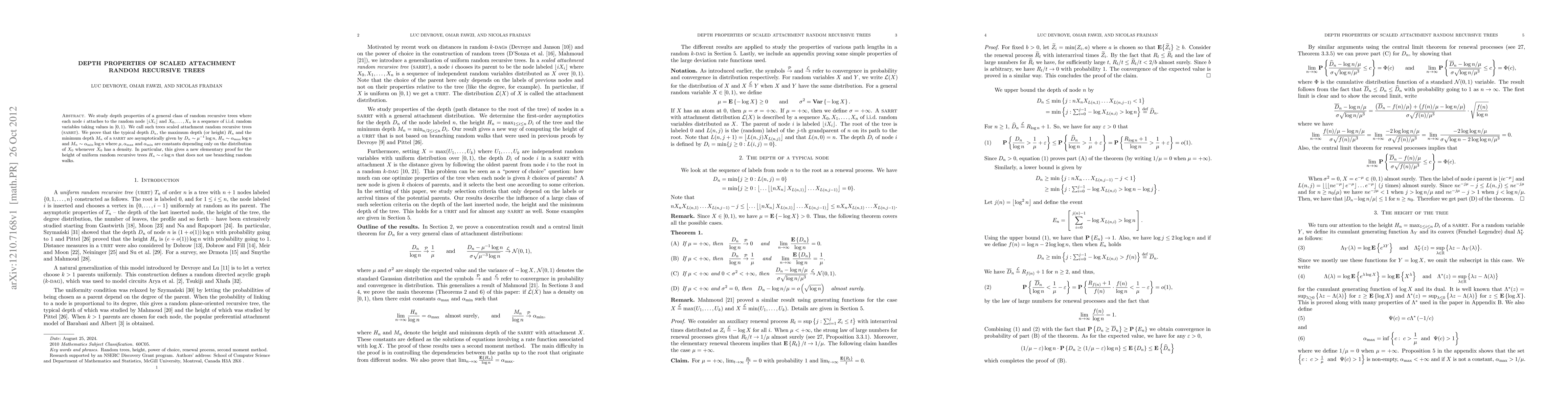 This paper investigates the depth properties of scaled attachment random recursive trees (SARRT), showing that typical depth, maximum depth, and minimum depth scale asymptotically with logarithms of the number of nodes, dependent on the distribution of attachment nodes. It provides a new proof for the height of uniform random recursive trees without using branching random walks.