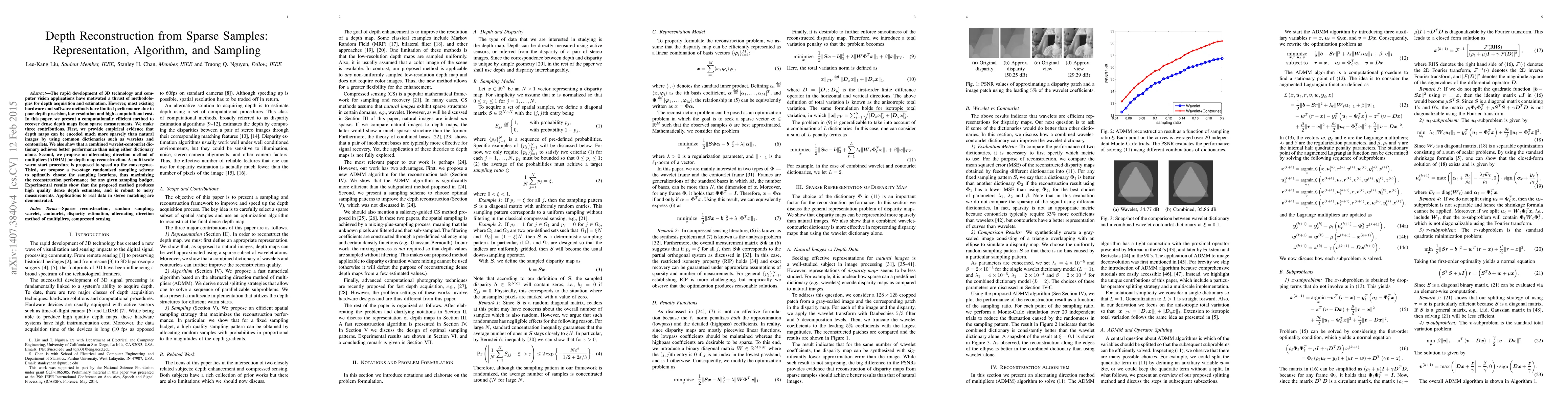 This paper presents a computationally efficient method for reconstructing dense depth maps from sparse measurements, leveraging sparse encoding with wavelet-contourlet dictionaries, an ADMM algorithm for fast reconstruction, and a two-stage randomized sampling scheme for optimal sampling location selection. Experimental results demonstrate high-quality depth estimation and robustness to noise.
