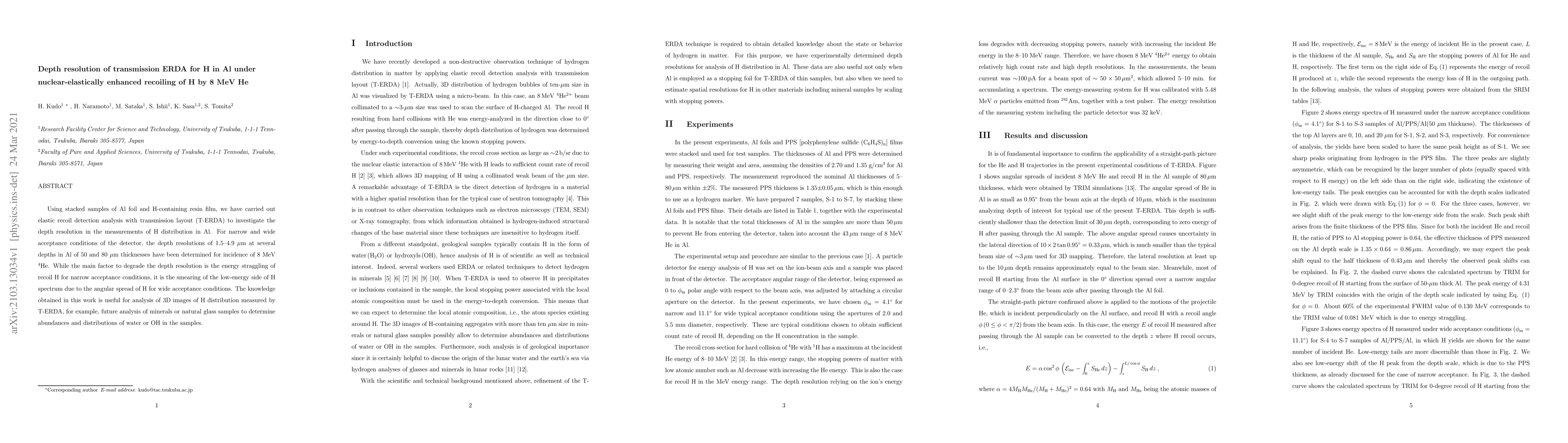 This paper investigates the depth resolution of transmission elastic recoil detection analysis (T-ERDA) for hydrogen in aluminum, focusing on the nuclear-elastically enhanced recoiling of hydrogen by 8 MeV helium ions. The study identifies factors affecting depth resolution based on detector acceptance conditions.