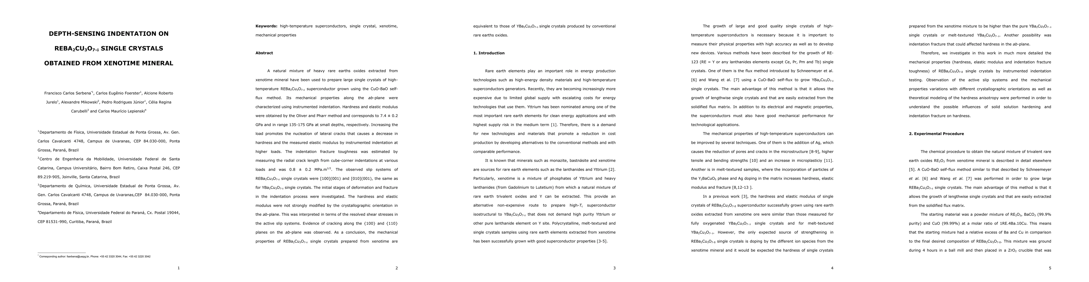 A natural mixture of heavy rare earths oxides extracted from xenotime mineral have been used to prepare large single crystals of high-temperature REBa2Cu3O(7-\delta) superconductor grown using the CuO-BaO self-flux method. Its mechanical properties along the ab-plane were characterized using instrumented indentation. Hardness and elastic modulus were obtained by the Oliver and Pharr method and corresponds to 7.4 \pm 0.2 GPa and in range 135-175 GPa at small depths, respectively. Increasing the load promotes the nucleation of lateral cracks that causes a decrease in hardness and the measured elastic modulus by instrumented indentation at higher loads. The indentation fracture toughness was estimated by measuring the radial crack length from cube-corner indentations at various loads and was 0.8 \pm 0.2 MPa.m1/2. The observed slip systems of REBa2Cu3O(7-\delta) single crystals were [100](001) and [010](001), the same as for YBa2Cu3O(7-\delta) single crystals. The initial stages of deformation and fracture in the indentation process were investigated. The hardness and elastic modulus were not strongly modified by the crystallographic orientation in the ab-plane. This was interpreted in terms of the resolved shear stresses in the active slip systems. Evidence of cracking along the {100} and {110} planes on the ab-plane was observed. As a conclusion, the mechanical properties of REBa2Cu3O(7-\delta) single crystals prepared from xenotime are equivalent to those of YBa2Cu3O(7-\delta) single crystals produced by conventional rare earths oxides.