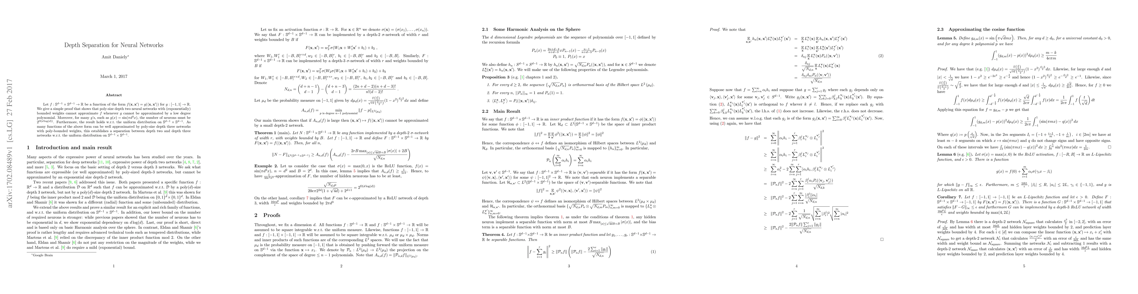 This paper proves that poly-size depth two neural networks with bounded weights cannot approximate certain functions unless those functions can be approximated by low-degree polynomials. It establishes a separation between depth two and depth three networks for approximating such functions under the uniform distribution.