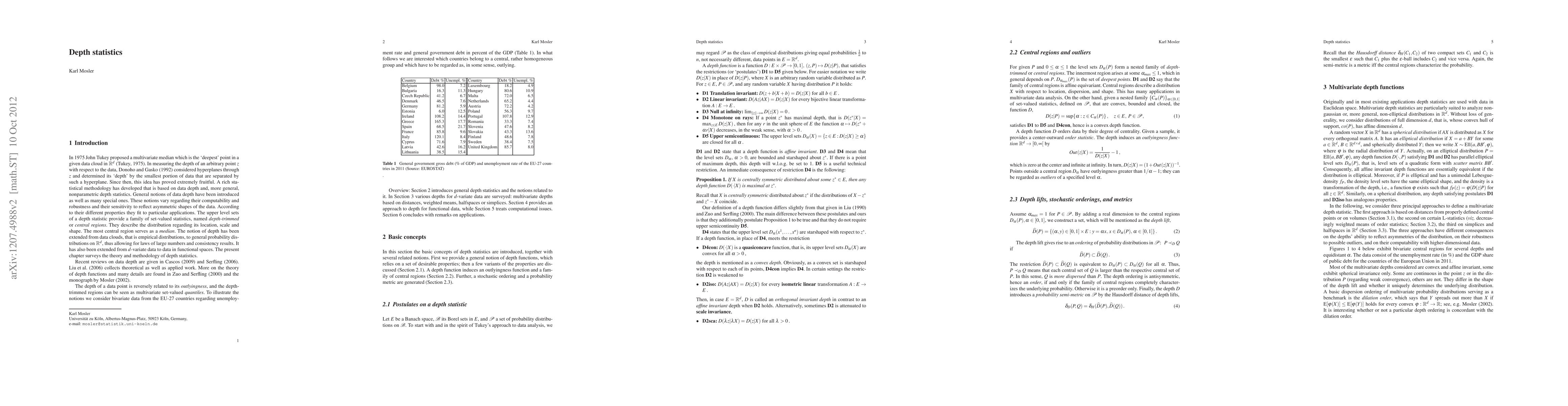 In 1975 John Tukey proposed a multivariate median which is the 'deepest' point in a given data cloud in R^d. Later, in measuring the depth of an arbitrary point z with respect to the data, David Donoho and Miriam Gasko considered hyperplanes through z and determined its 'depth' by the smallest portion of data that are separated by such a hyperplane. Since then, these ideas has proved extremely fruitful. A rich statistical methodology has developed that is based on data depth and, more general, nonparametric depth statistics. General notions of data depth have been introduced as well as many special ones. These notions vary regarding their computability and robustness and their sensitivity to reflect asymmetric shapes of the data. According to their different properties they fit to particular applications. The upper level sets of a depth statistic provide a family of set-valued statistics, named depth-trimmed or central regions. They describe the distribution regarding its location, scale and shape. The most central region serves as a median. The notion of depth has been extended from data clouds, that is empirical distributions, to general probability distributions on R^d, thus allowing for laws of large numbers and consistency results. It has also been extended from d-variate data to data in functional spaces.