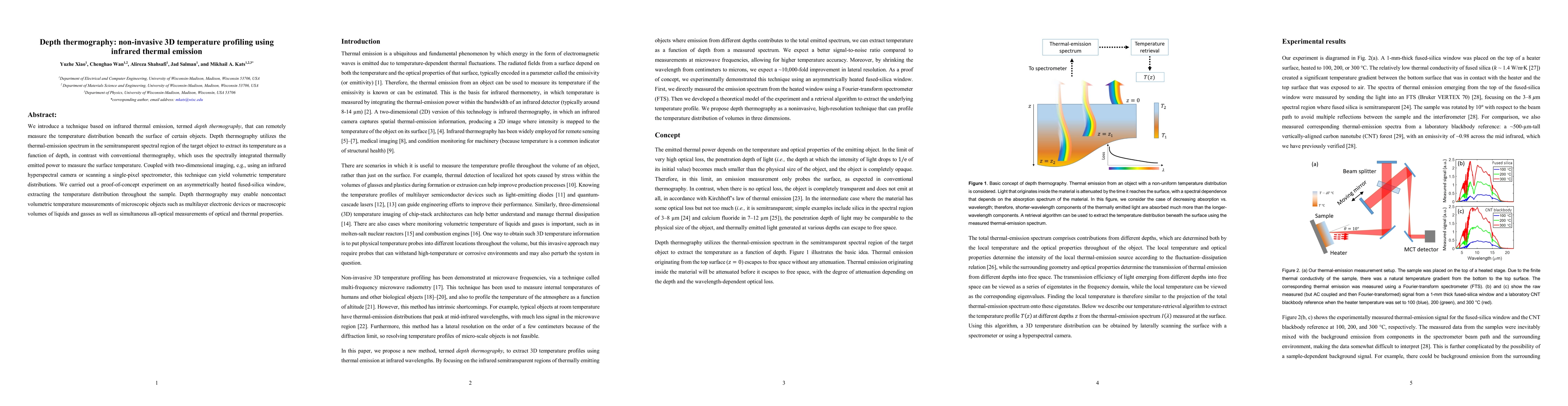 Depth thermography is a novel technique using infrared thermal emission to measure temperature distribution beneath an object's surface. This method extracts temperature as a function of depth by analyzing the thermal-emission spectrum in the semitransparent region, enabling noncontact volumetric temperature measurements.