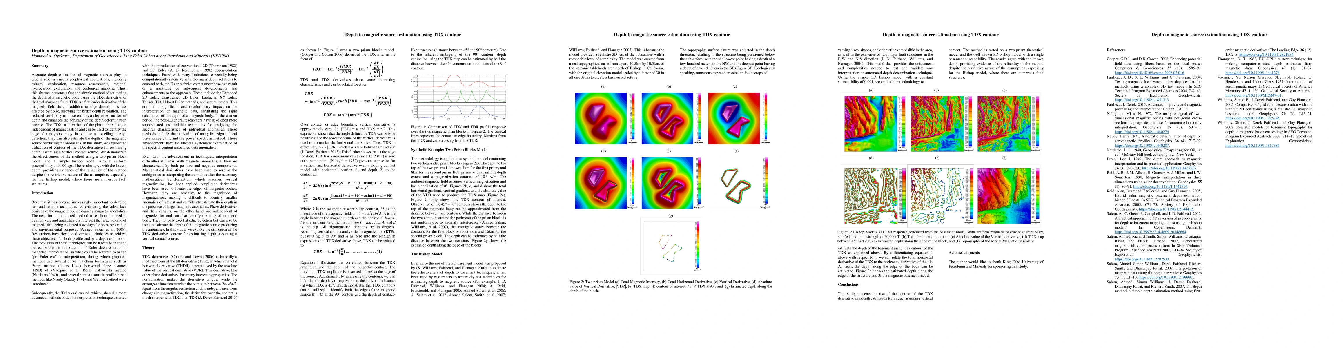 The research proposes a method for estimating the depth of magnetic sources using the TDX (Total Derivative of X) contour of the total magnetic field derivative. TDX is a first-order derivative less affected by noise, enhancing depth resolution and accuracy.