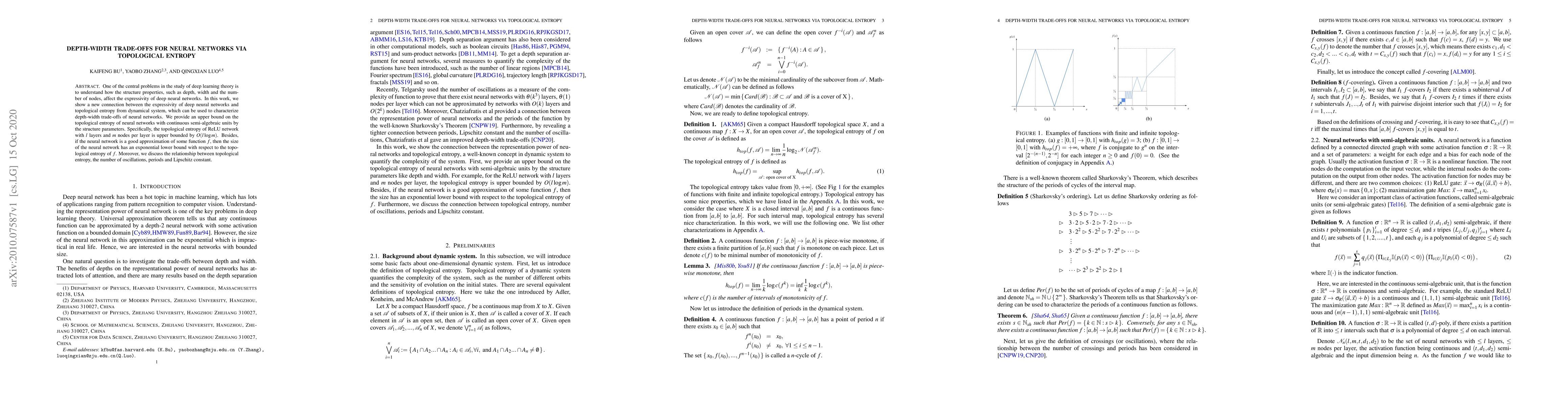 One of the central problems in the study of deep learning theory is to understand how the structure properties, such as depth, width and the number of nodes, affect the expressivity of deep neural networks. In this work, we show a new connection between the expressivity of deep neural networks and topological entropy from dynamical system, which can be used to characterize depth-width trade-offs of neural networks. We provide an upper bound on the topological entropy of neural networks with continuous semi-algebraic units by the structure parameters. Specifically, the topological entropy of ReLU network with $l$ layers and $m$ nodes per layer is upper bounded by $O(l\log m)$. Besides, if the neural network is a good approximation of some function $f$, then the size of the neural network has an exponential lower bound with respect to the topological entropy of $f$. Moreover, we discuss the relationship between topological entropy, the number of oscillations, periods and Lipschitz constant.