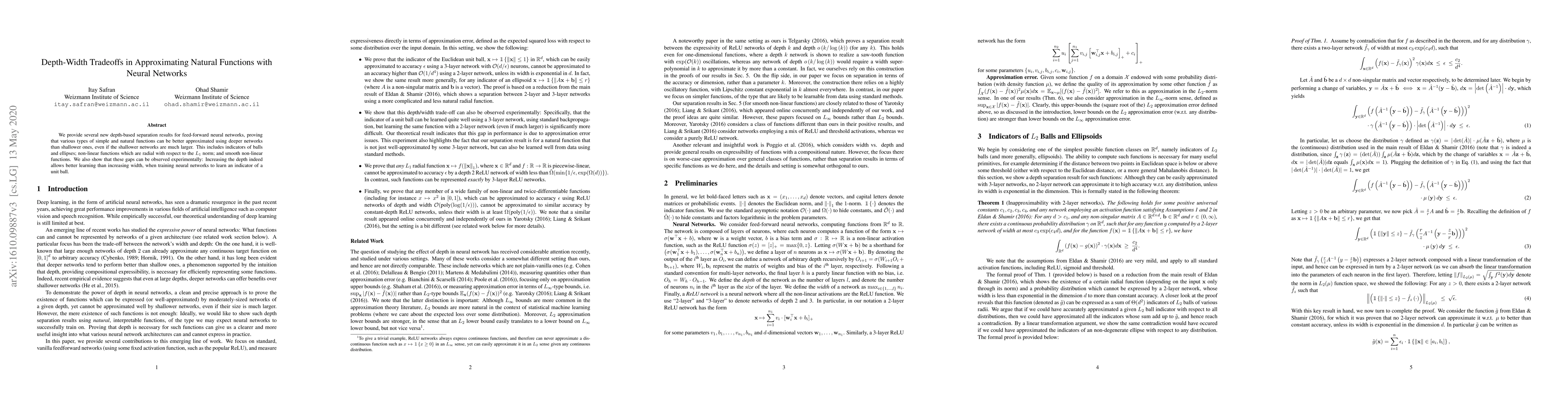We provide several new depth-based separation results for feed-forward neural networks, proving that various types of simple and natural functions can be better approximated using deeper networks than shallower ones, even if the shallower networks are much larger. This includes indicators of balls and ellipses; non-linear functions which are radial with respect to the $L_1$ norm; and smooth non-linear functions. We also show that these gaps can be observed experimentally: Increasing the depth indeed allows better learning than increasing width, when training neural networks to learn an indicator of a unit ball.