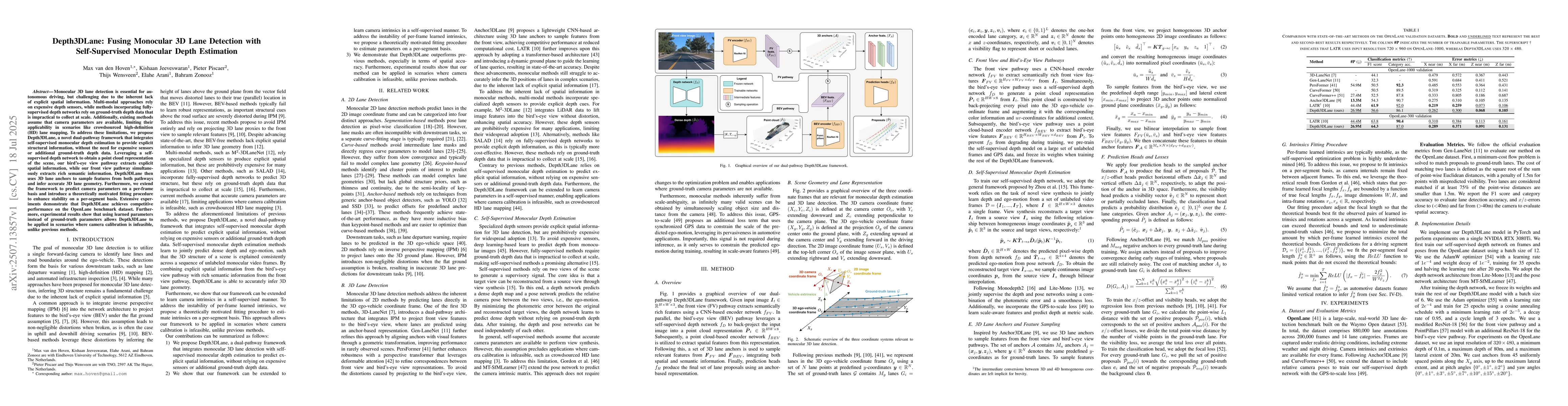 Monocular 3D lane detection is essential for autonomous driving, but challenging due to the inherent lack of explicit spatial information. Multi-modal approaches rely on expensive depth sensors, while methods incorporating fully-supervised depth networks rely on ground-truth depth data that is impractical to collect at scale. Additionally, existing methods assume that camera parameters are available, limiting their applicability in scenarios like crowdsourced high-definition (HD) lane mapping. To address these limitations, we propose Depth3DLane, a novel dual-pathway framework that integrates self-supervised monocular depth estimation to provide explicit structural information, without the need for expensive sensors or additional ground-truth depth data. Leveraging a self-supervised depth network to obtain a point cloud representation of the scene, our bird's-eye view pathway extracts explicit spatial information, while our front view pathway simultaneously extracts rich semantic information. Depth3DLane then uses 3D lane anchors to sample features from both pathways and infer accurate 3D lane geometry. Furthermore, we extend the framework to predict camera parameters on a per-frame basis and introduce a theoretically motivated fitting procedure to enhance stability on a per-segment basis. Extensive experiments demonstrate that Depth3DLane achieves competitive performance on the OpenLane benchmark dataset. Furthermore, experimental results show that using learned parameters instead of ground-truth parameters allows Depth3DLane to be applied in scenarios where camera calibration is infeasible, unlike previous methods.
