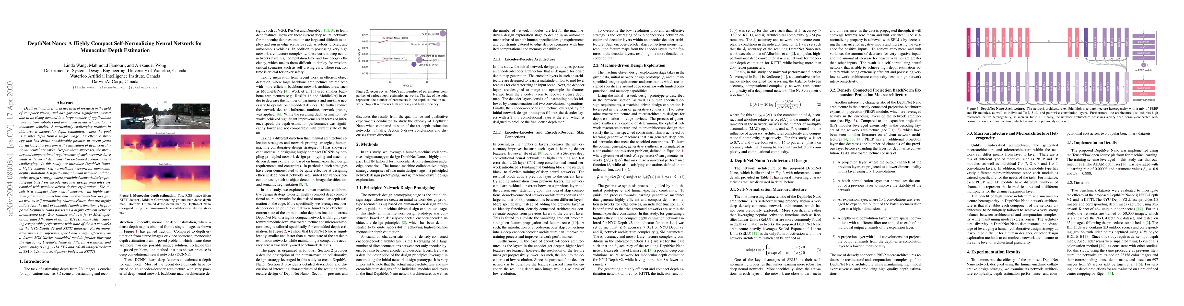 DepthNet Nano is a compact self-normalizing neural network designed for efficient monocular depth estimation, achieving state-of-the-art performance while being 24X smaller and 42X fewer in MAC operations compared to existing methods, demonstrating high efficiency in embedded scenarios.