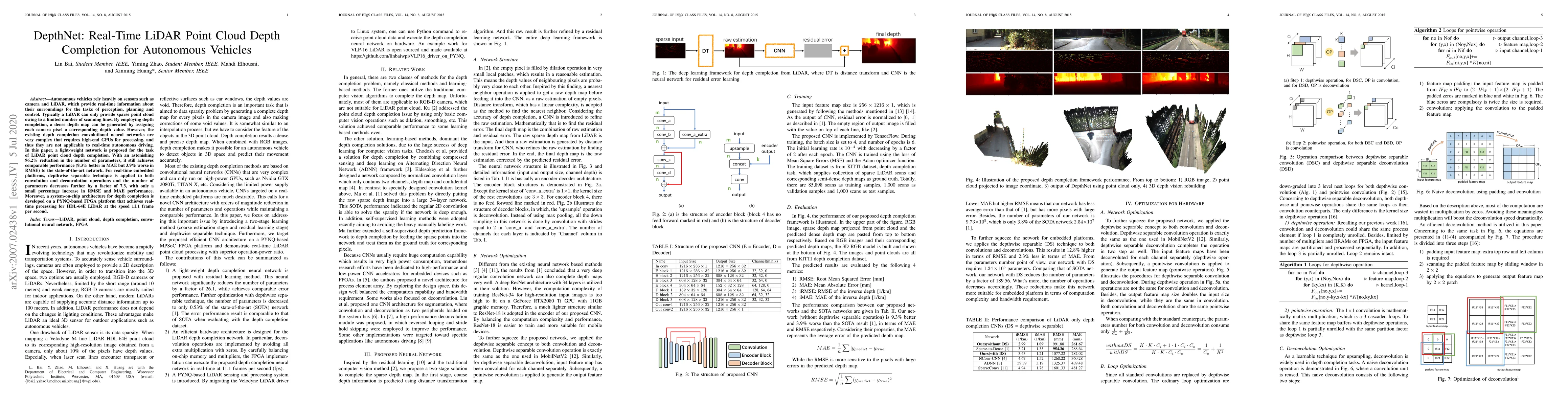 DepthNet proposes a lightweight network for real-time LiDAR point cloud depth completion, achieving a 96.2% reduction in parameters while maintaining competitive performance. The system further optimizes processing speed using depthwise separable convolutions, enabling real-time depth completion on an FPGA platform.